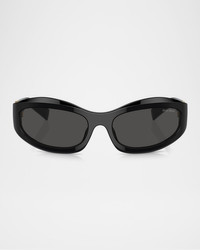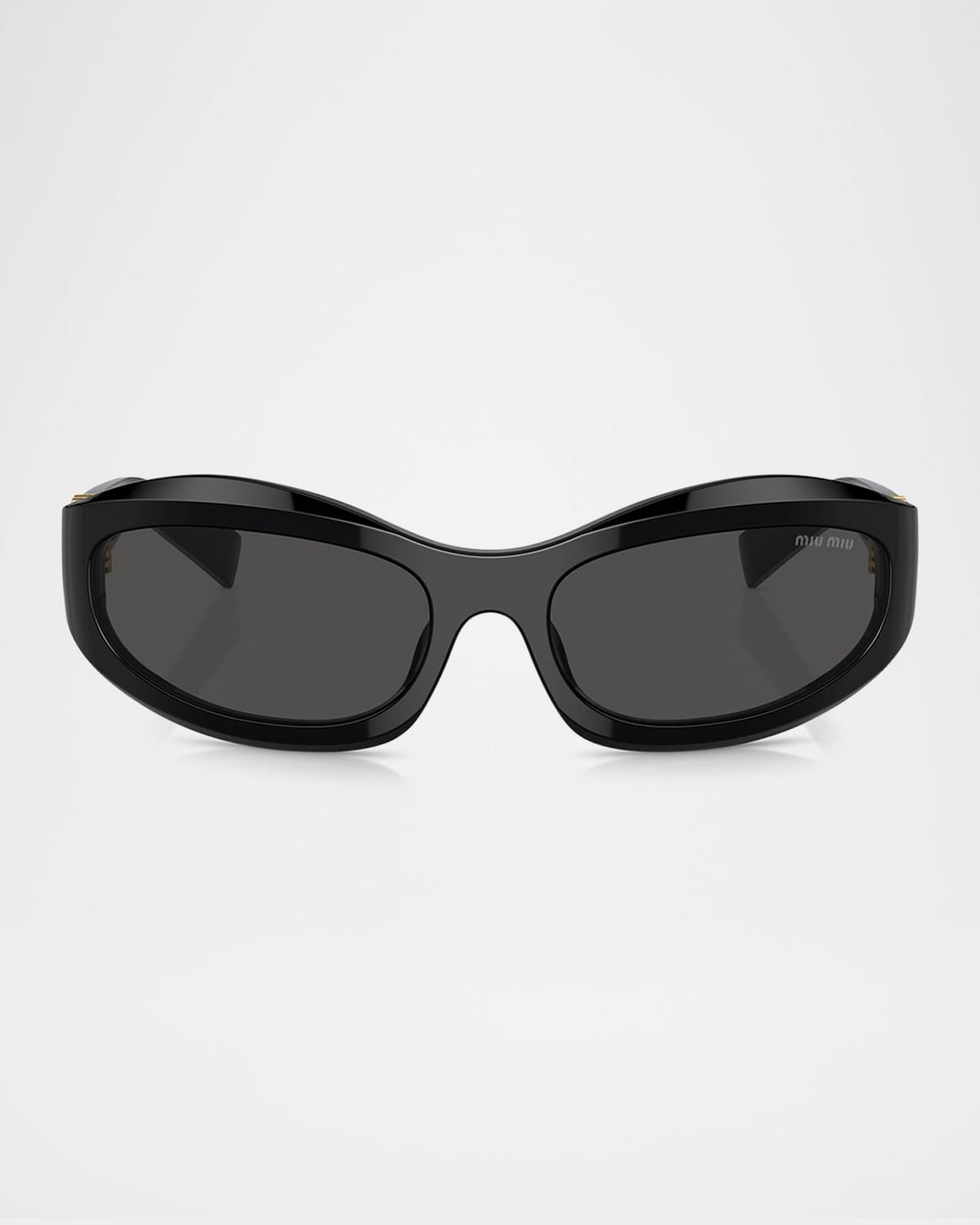- Miu Miu "14ZSF" oval sunglasses in acetate - Featuring a contemporary wrap-around shape - Solid-color lenses - Logo on temples - Thin, tapered arms - Spot clean - Each pair of sunglasses comes with a cleaning cloth and case to clean and protect your sunglasses from scratches and damage. - 100% UVA/UVB protection - Made in Italy - Proposition 65 warning for California residents