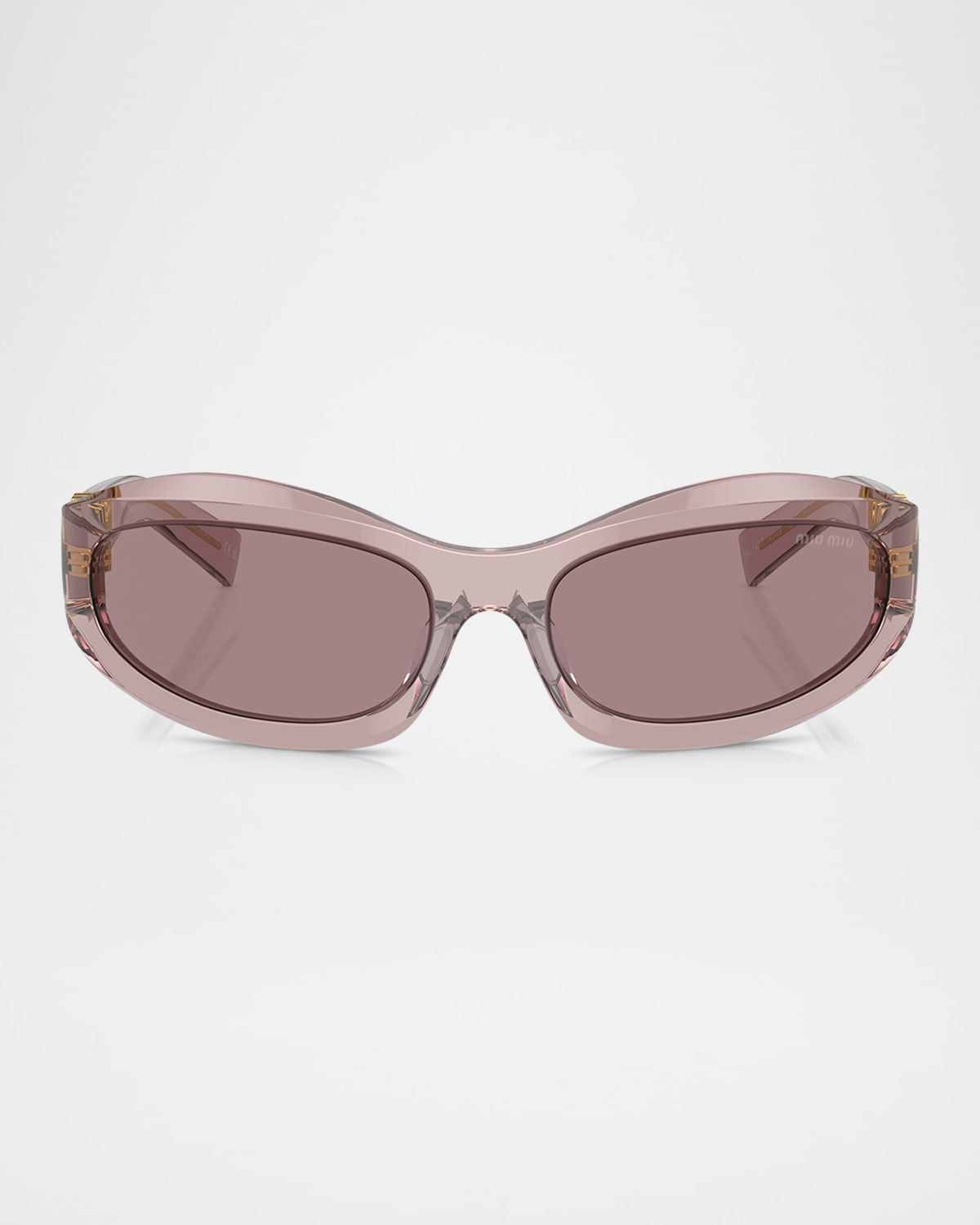 - Miu Miu "14ZSF" oval sunglasses in acetate - Featuring a contemporary wrap-around shape - Solid-color lenses - Logo on temples - Thin, tapered arms - Spot clean - Each pair of sunglasses comes with a cleaning cloth and case to clean and protect your sunglasses from scratches and damage. - 100% UVA/UVB protection - Made in Italy - Proposition 65 warning for California residents