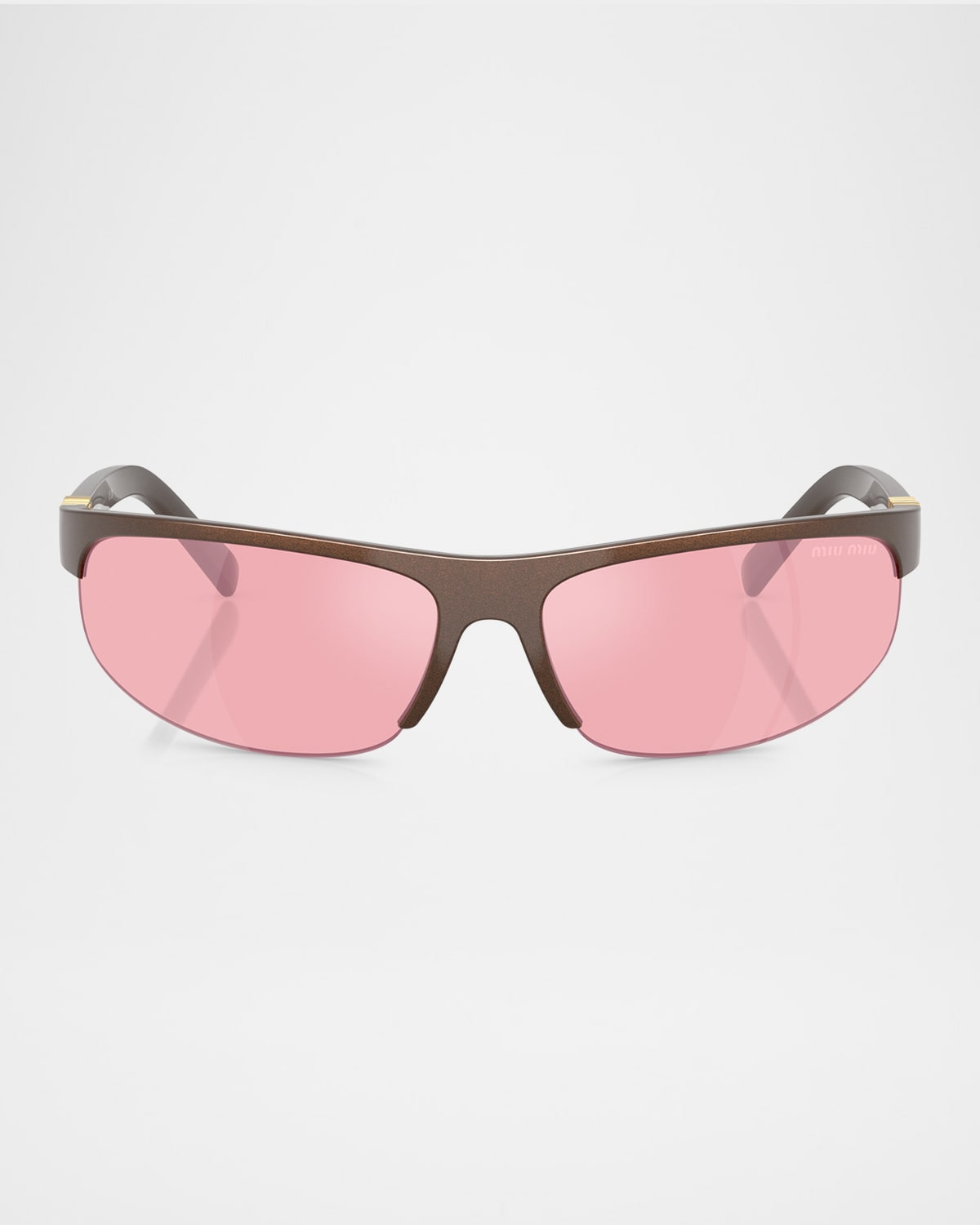 - Miu Miu "A02S" semi-rimless oval sunglasses in plastic - Solid-color lenses - Logo on temples - Thin, tapered arms - Each pair of sunglasses comes with a cleaning cloth and case to clean and protect your sunglasses from scratches and damage. - Spot clean - 100% UVA/UVB protection - Made in Italy - Proposition 65 warning for California residents