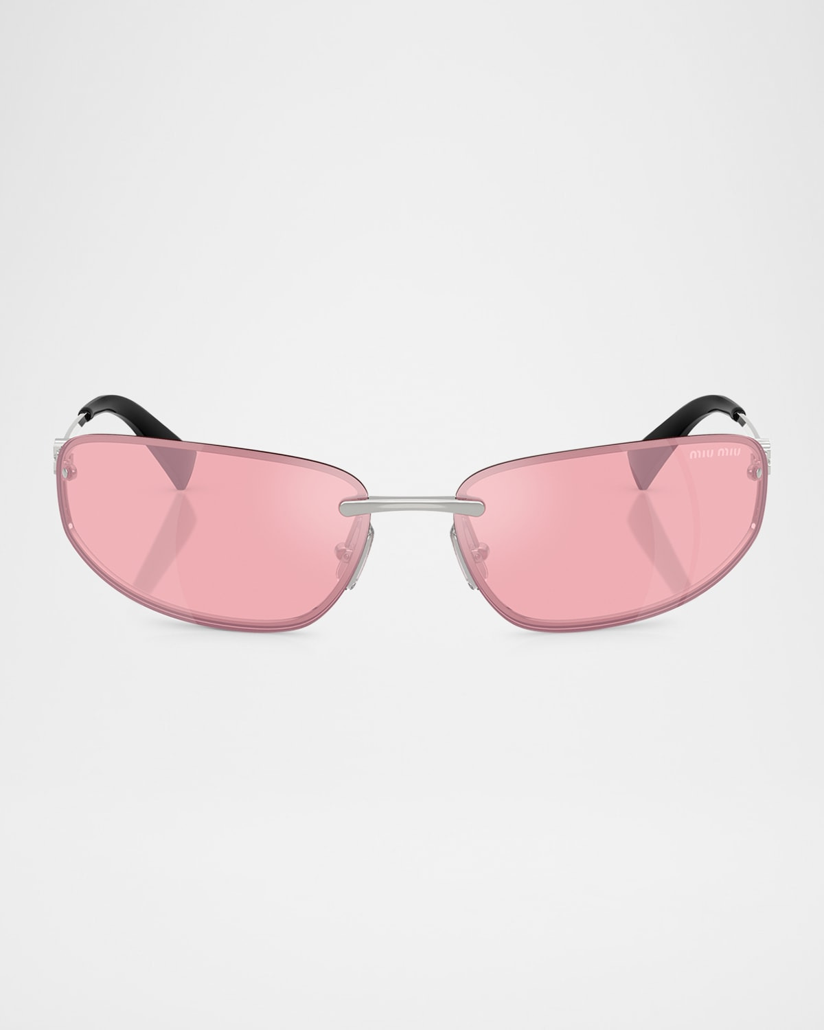 - Miu Miu "A50S" rimless oval sunglasses in metal - Solid color lenses - Adjustable nose pads - Logo on temples - Thin, tapered arms - Capped earpieces - Each pair of sunglasses come with a cleaning cloth and case to clean and protect your sunglasses from scratches and damage. - Spot clean - 100% UVA/UVB protection - Made in Italy - Proposition 65 warning for California residents