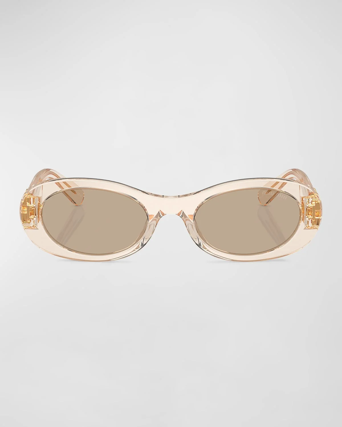 - Miu Miu oval sunglasses in acetate and plastic - Lens/bridge/temple (in mm): 50-20-140 - Solid-color lenses; logo on corner - Saddle nose bridge - Signature raised logo on temples - Wide, tapered arms - 100% UVA/UVB protection - Made in Italy - Proposition 65 warning for California residents