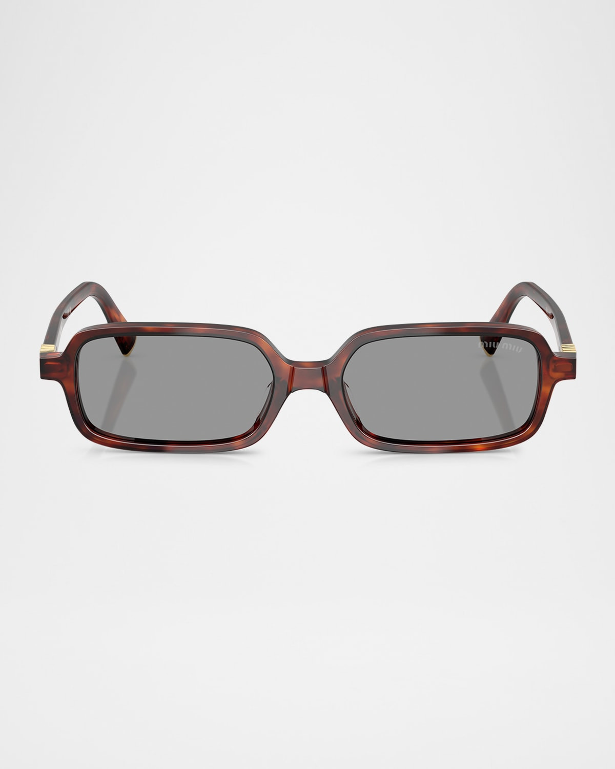 - Miu Miu "MU 11ZSF" rectangle sunglasses in acetate and plastic - Eye/bridge/temple (in mm): 52-15-140 - Solid lenses; logo on corner - Saddle nose bridge - Signature raised logo on temples - Thin, tapered arms - 100% UVA/UVB protection - Made in Italy - Proposition 65 warning for California residents
