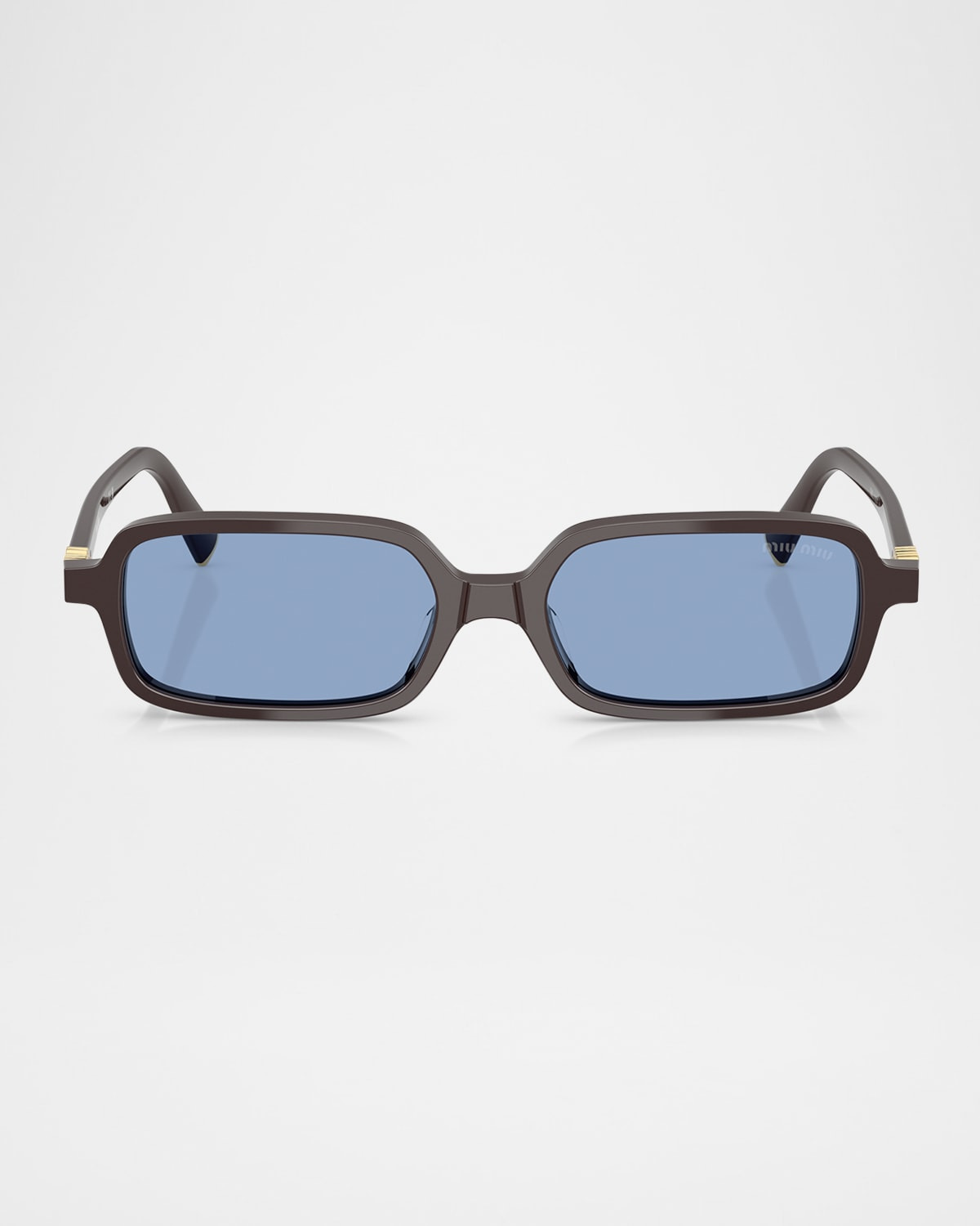 - Miu Miu "MU 11ZSF" rectangle sunglasses in acetate and plastic - Eye/bridge/temple (in mm): 52-15-140 - Solid lenses; logo on corner - Saddle nose bridge - Signature raised logo on temples - Thin, tapered arms - 100% UVA/UVB protection - Made in Italy - Proposition 65 warning for California residents