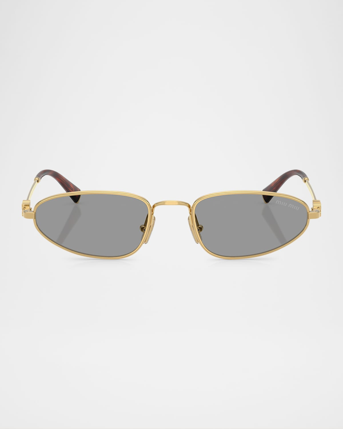 - Miu Miu oval sunglasses in metal - Solid lenses; logo on corner - Adjustable nose pads - Logo on temples - Thin, tapered arms - Capped earpieces - 100% UVA/UVB protection - Made in Italy - Proposition 65 warning for California residents