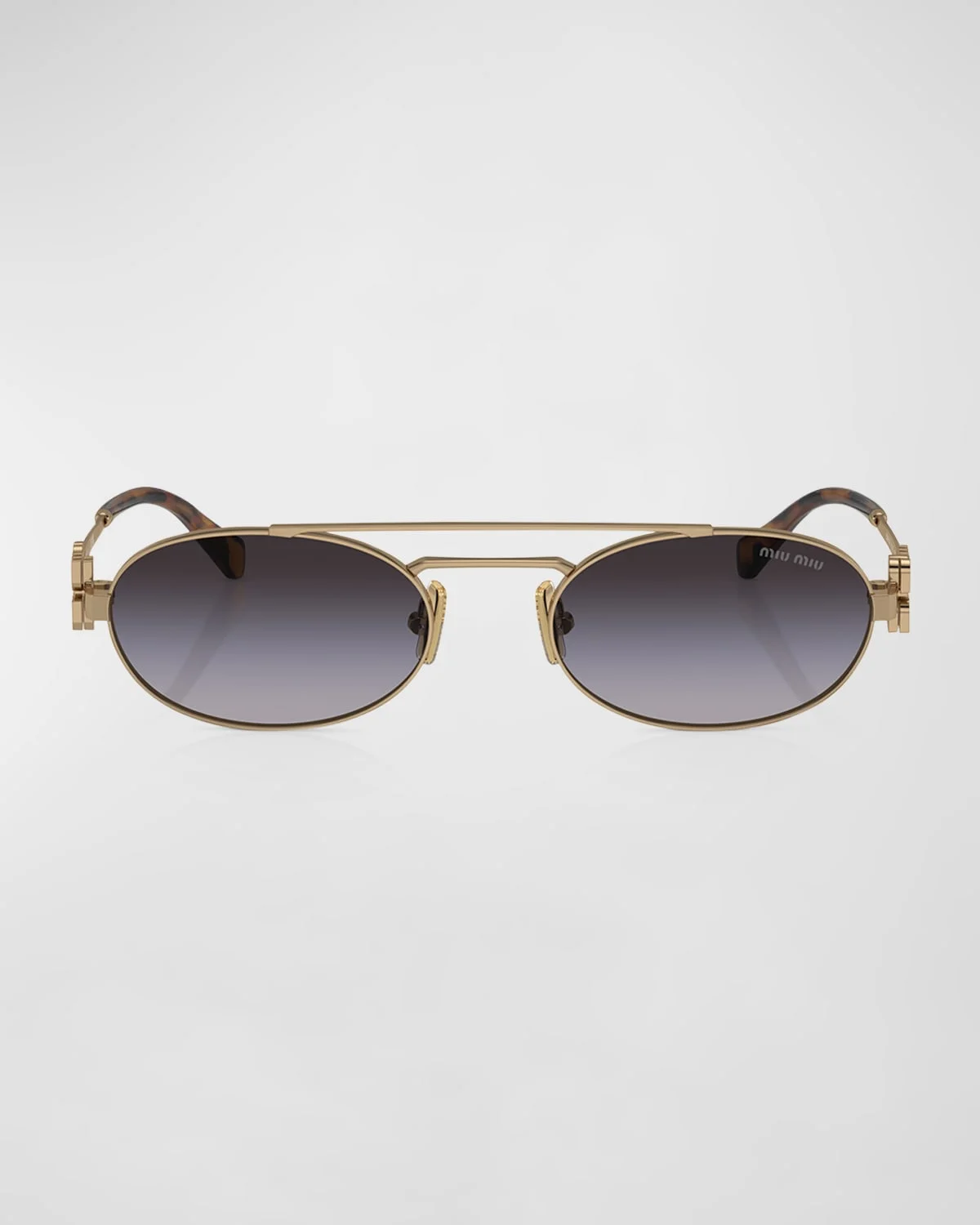 - Miu Miu oval sunglasses in metal - Lens/bridge/temple (in mm): 53-19-140 - Gradient lenses; logo on corner - Double nose bridge - Adjustable nose pads - Logo on temples - Tapered, thin arms - Capped earpieces - 100% UVA/UVB protection - Made in Italy - Proposition 65 warning for California residents