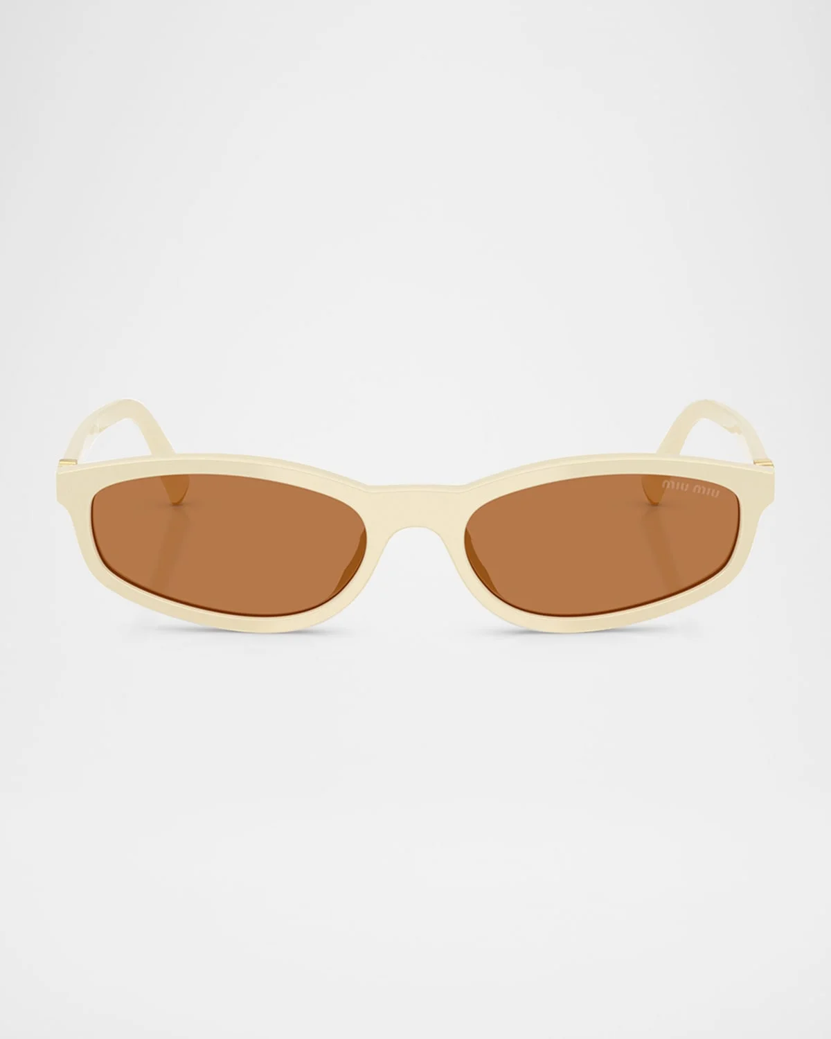 - Miu Miu oval sunglasses from the Miu Regarde collection feature a low, feminine shape and the signature vertical logo. - Eye/bridge/temple (in mm): 54-17-140 - Monochromatic lenses - Saddle nose bridge - Vertical logo on temples - Thin, tapered arms - 100% UVA/UVB protection - Acetate/plastic - Spot clean - Made in Italy - Proposition 65 warning for California residents