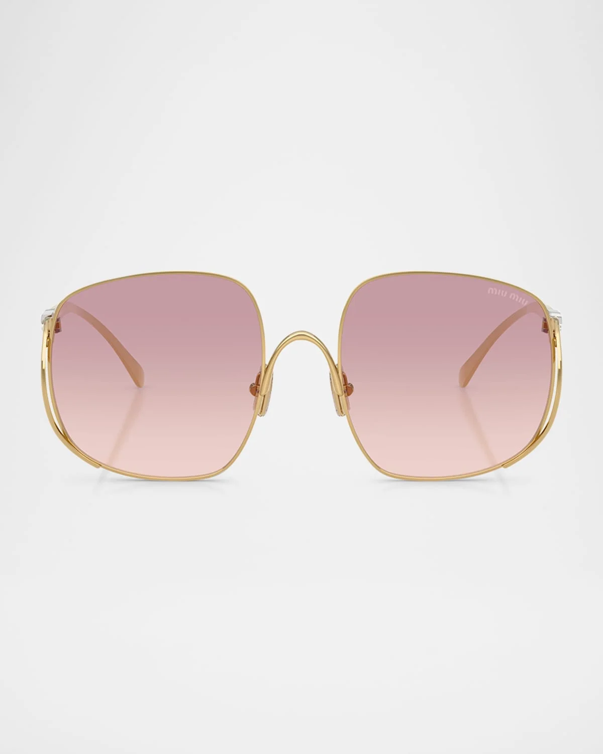 - Miu Miu "MU A57S" sunglasses embody feminine elegance with a modern twist, featuring oversized square lenses framed in lightweight metal. The airy construction, sculptural curves, and delicate detailing create a sophisticated yet playful statement. - Eye/bridge/temple (in mm): 54-20-140mm - Gradient lenses - Adjustable nose pads - Silver-tone logos on temples - Thin, tapered arms - 100% UVA/UVB protection - Metal - Spot clean - Made in Italy - Proposition 65 warning for California residents