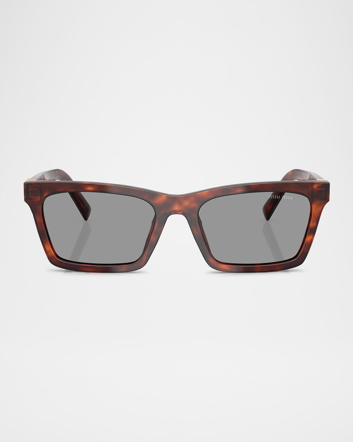 - Miu Miu "A05S" rectangular sunglasses in acetate - Eye/bridge/temple (in mm): 55-19-140 - Solid lenses - Saddle nose bridge - Thick, tapered arms - Logo at lens - Comes with case and cloth - Acetate - 100% UVA/UVB protection - Made in Italy - Proposition 65 warning for California residents