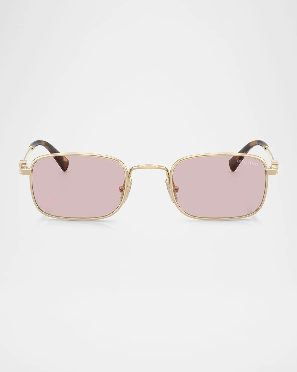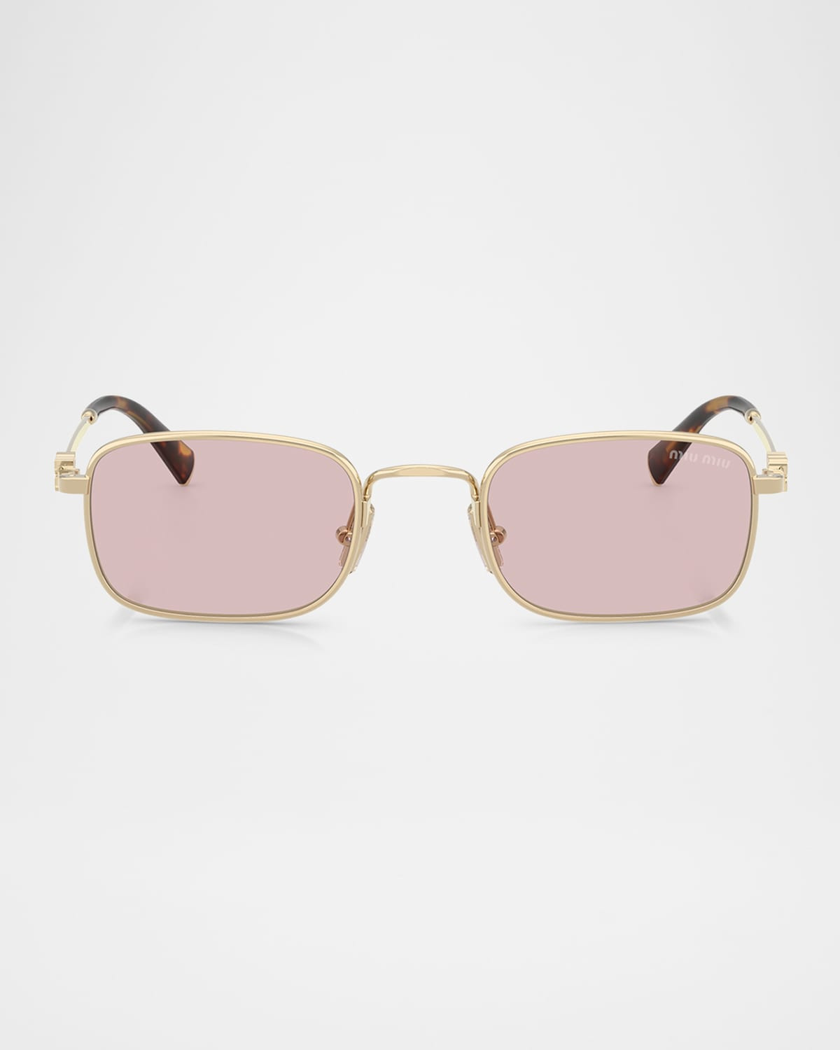 - Miu Miu "MuA53S" rectangular sunglasses in metal - Eye/bridge/temple (in mm): 49-22-140 - Solid lenses - Adjustable nose pads - Thin, tapered arms - Logo at lens - Comes with case and cloth - Metal - 100% UVA/UVB protection - Made in Italy - Proposition 65 warning for California residents
