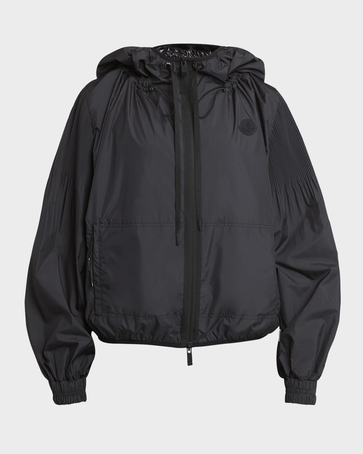 Moncler "Auxonne" matte windbreaker jacket with pleating detailing Hooded neckline; adjustable drawstrings Twoway front zipper Long sleeves; elastic cuffs Silicone chest logo patch Split kangaroo pocket Hip length Elasticized hem Polyester Dry clean, hand wash Made in Romania
