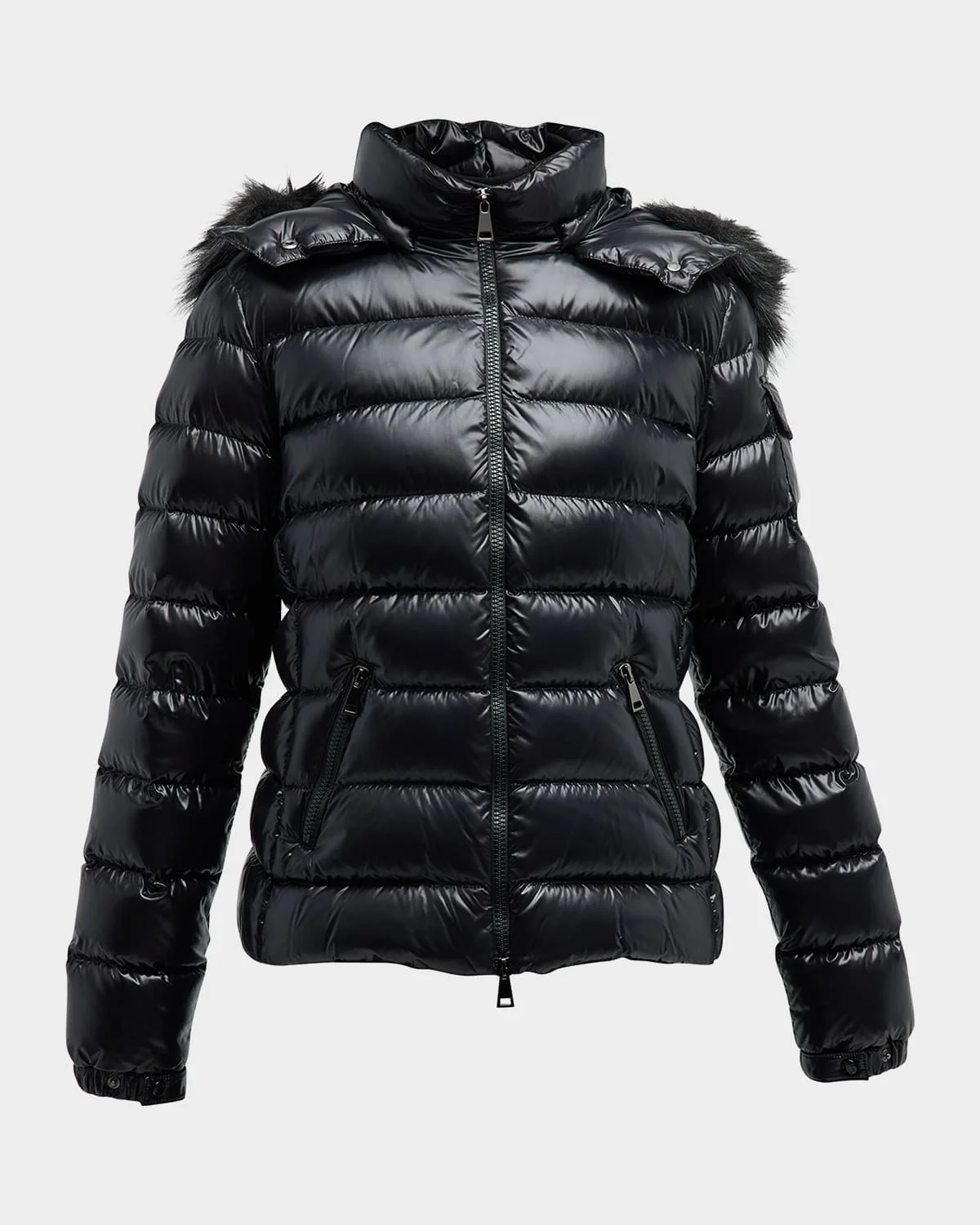 Moncler "Badyf" puffer coat featuring a removable hood with a faux fur ruff Stand collar Twoway zipper at front Long sleeves; elasticized cuffs Zip pockets at sides Patch pocket with logo at left sleeve Hip length Modacrylic/polyester Lining: Nylon Down/feather fill Dry clean Made in Bulgaria