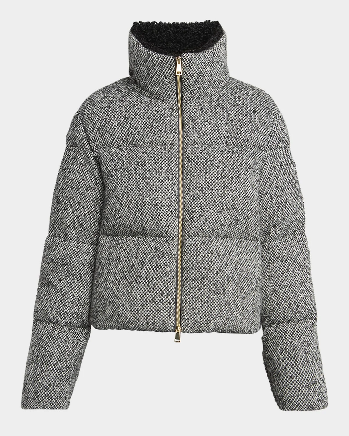 - Moncler "Brezesse" wool-blend short jacket enhanced with faux shearling lining and gold-tone hardware - Stand collar - Long sleeves - Features leather logo patch on left sleeve - Classic fit - Hem sits at the hip - Two-way zip-front - Wool/nylon/polyamide/lyocell - Fill: Down/feather - Lining: Nylon/polyester - Professional cleaning recommended - Imported