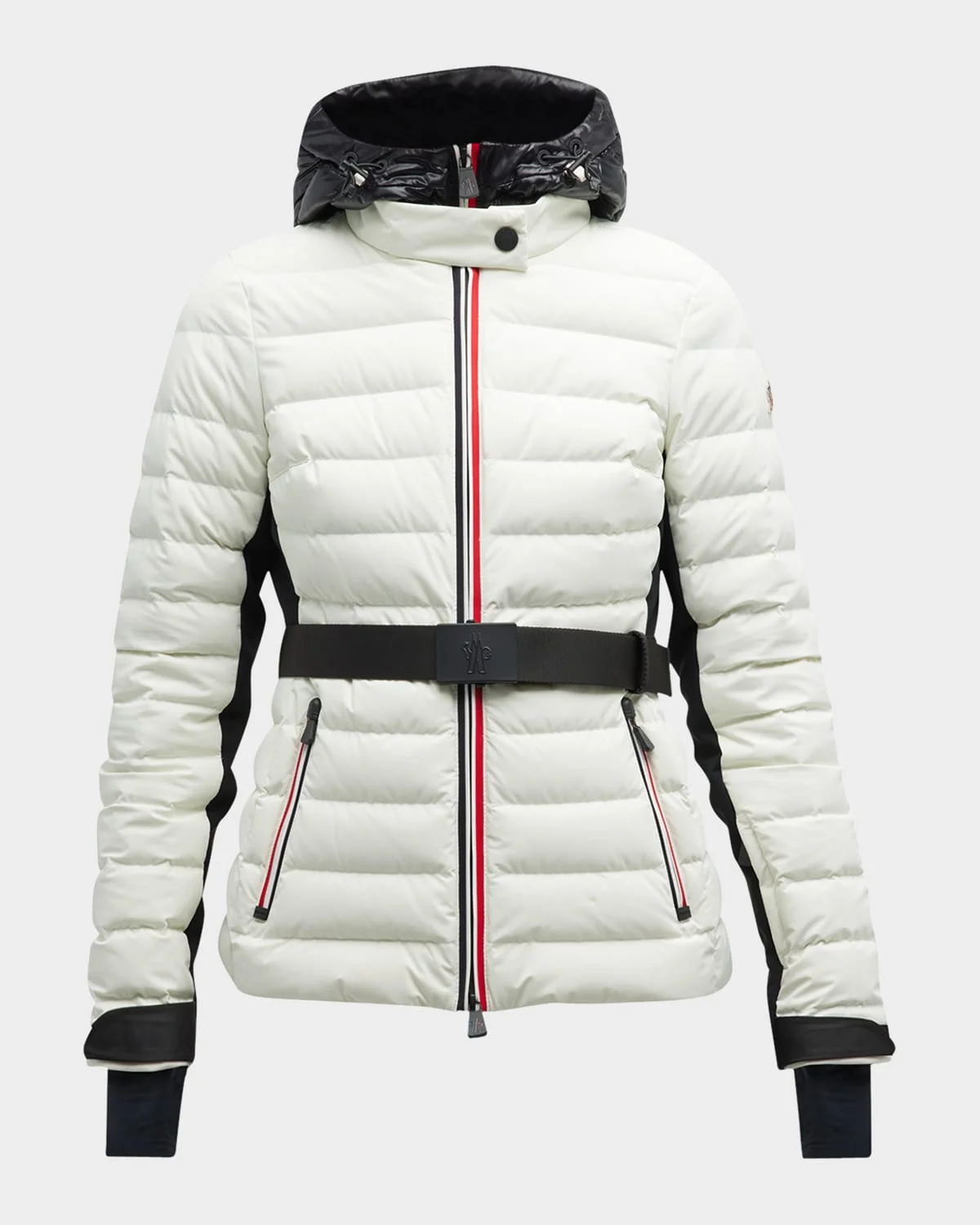 Moncler Grenoble "Bruche" utility style puffer jacket with contrast details throughout Hooded collar; snap closure Twoway zip front Interior snap button closure Long sleeves; thumbhole cuffs Signature logo patch at left Belted waist Side zip pockets; interior pocket Hip length Relaxed fit Polyamide/polyester/nylon Lining: Polyester Fill: Down/feather Dry clean Made in Romania
