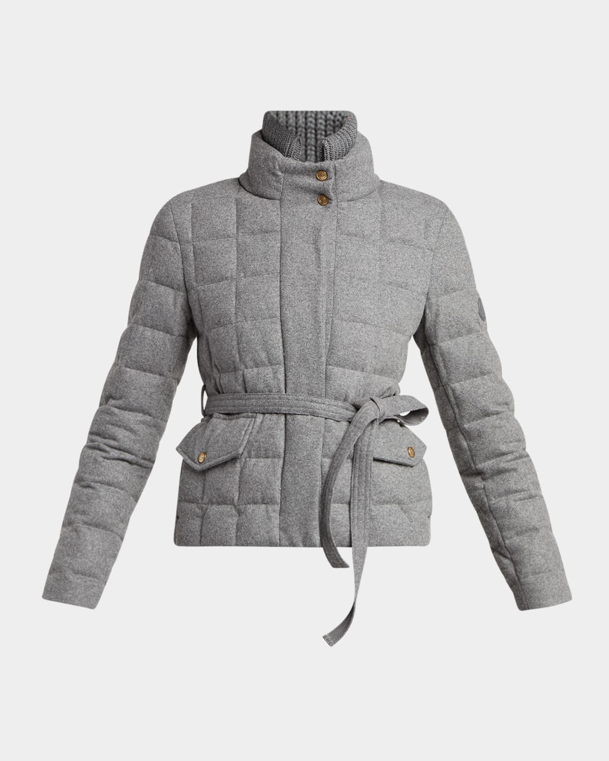 - Moncler "Bussettes" quilted puffer jacket with gold-tone hardware - Double stand collar - Long sleeves - Tonal logo patch at left sleeve - Self-tie belt - Hip flap pockets - Classic fit - Two-way zip-front with snap placket - Polyester/wool/elastane - Fill: Down/feather - Lining: Nylon - Hand wash - Imported