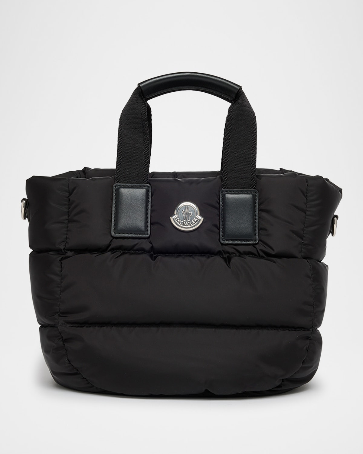 - Inspired by the iconic Moncler down jacket, the Caradoc bag is crafted from recycled nylon. Boasting an architectural, trapezoid shape, the mini tote fits your daily work or shopping essentials. - Moncler "Caradoc" quilted micro tote bag in recycled nylon and leather - Flat top handles with leather grip - Adjustable and detachable crossbody strap - Front metal logo plaque - Interior, one slip pocket - Zip top closure - Approx. 6.5"L x 5.1"H x 3.1"D - Fill: Down/feather - Lining: Acrylic/cotton - Professional cleaning recommended - Made in Italy