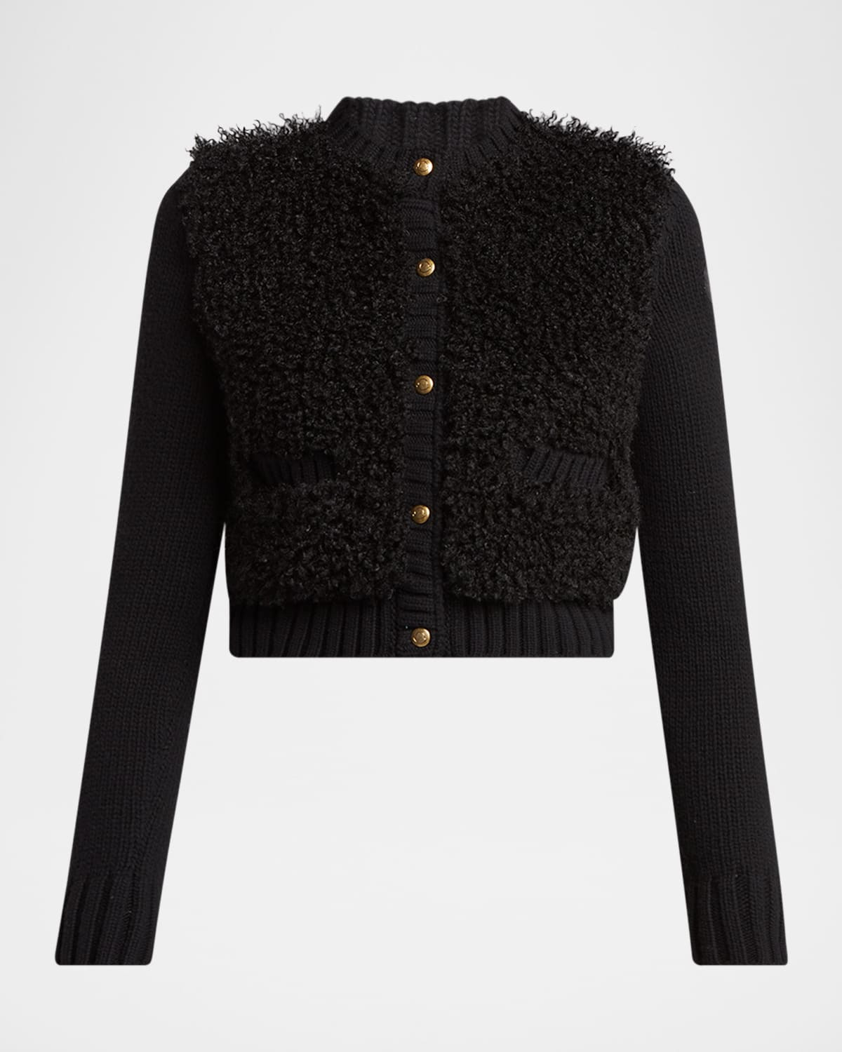 - Moncler wool-blend cardigan elevated with a curly faux-fur (nylon) front panel and a quilted back - Features an embroidered tonal logo patch on the left sleeve - Crew neckline - Long sleeves - Slim fit - Hem sits at the hip - Button-front - Virgin wool/nylon/polyamide/polyester - Lining: Nylon - Professional cleaning recommended - Imported