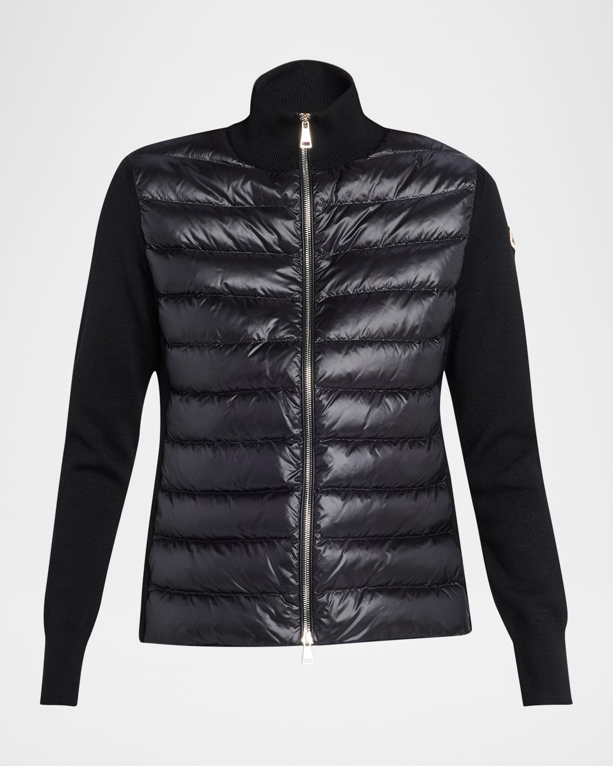 - Moncler quilted combo cardigan jacket with wool-knit paneling - Stand collar - Long sleeves - Embroidered logo patch at left sleeve - Classic fit - Hem sits at the hip - Two-way zip-front - Virgin wool/nylon/polyamide - Fill: Down/feather - Lining: Nylon - Professional cleaning recommended - Imported