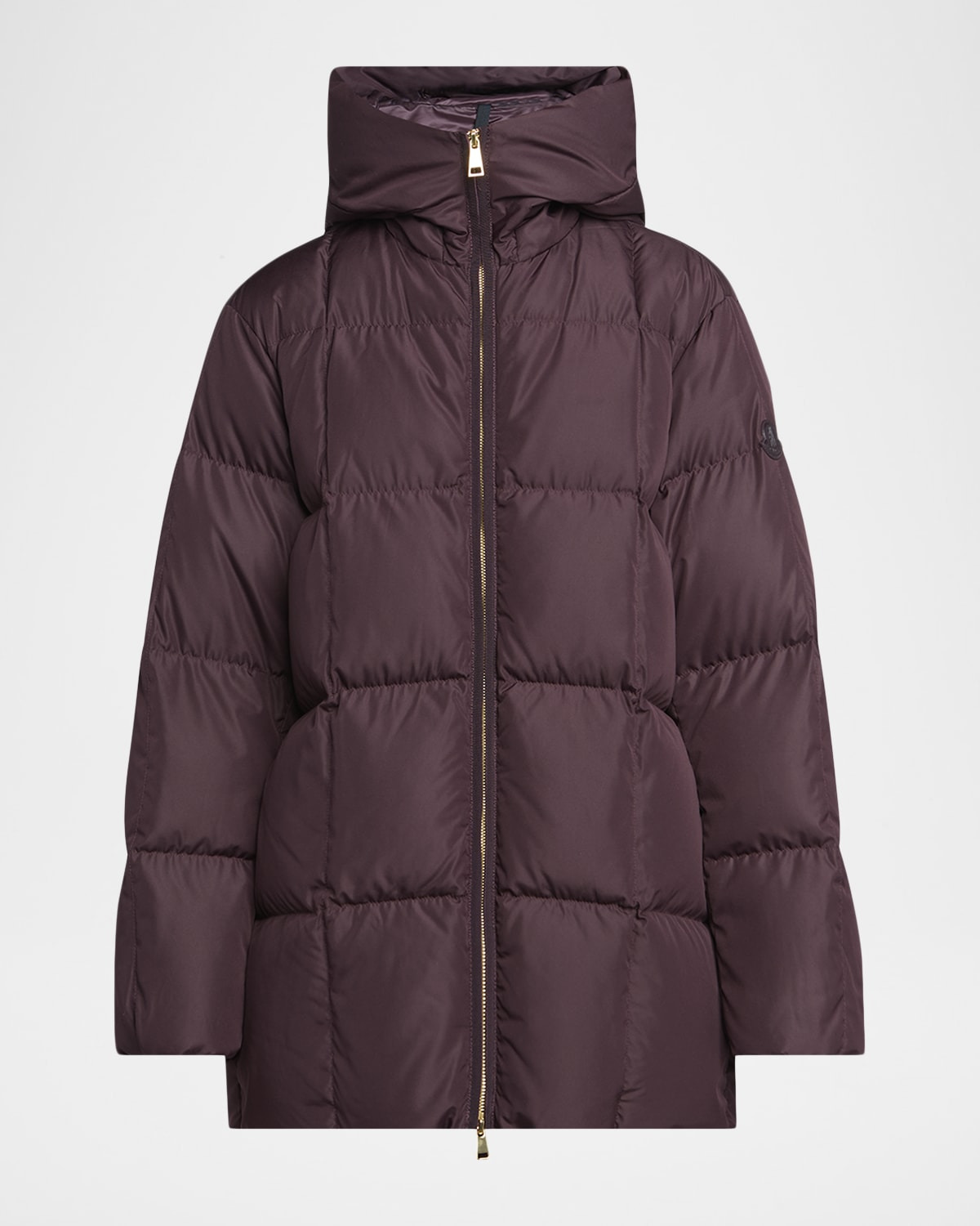 Moncler "Darbon" quilted puffer jacket enhanced with goldtone hardware Hooded neckline Long sleeves Features tonal leather logo patch on the left sleeve Oversized fit Midthigh length Twoway zipfront Polyester/leather Fill: Down/feather Lining: Nylon Hand wash Imported