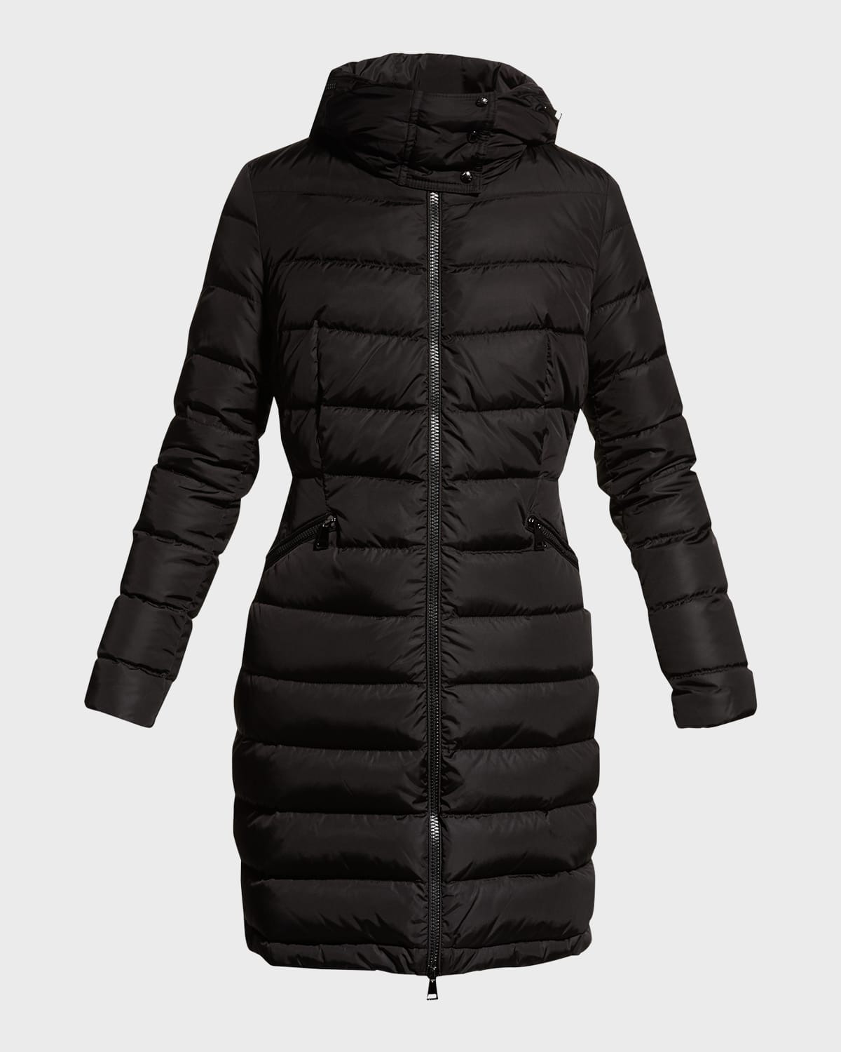 - Moncler "Flammette" warmth, protection, and elegance are merged together in the Flammette long down jacket for women. Crafted from nylon technique, the down coat has a feminine fit-and-flare silhouette, while a pull-out hood adds practicality to the piece. - Approx. 35" from shoulder to hem - Stand collar with snaps; hideaway hood - Long sleeves; classic logo patch. - Angled front zip pockets. - Zipper front - Fitted silhouette. - Medium length. - Nylon self and lining. - 90/10 down/feather fill. - Care instructions: Hand wash; Do not bleach; Do not tumble dry; Ironing maximum temperature 110°C (without steam); Dry cleaning in tetrachloroethene or with hydrocarbons (mild process); Do not professionally wet clean; Dry flat; Wash separately; Do not twist or wring; do not soak. - It is advisable to wash and iron the garment on reverse. - Made in Armenia. - Size Note: Item runs small, consider ordering a size upModel is 5'10"/177cm.