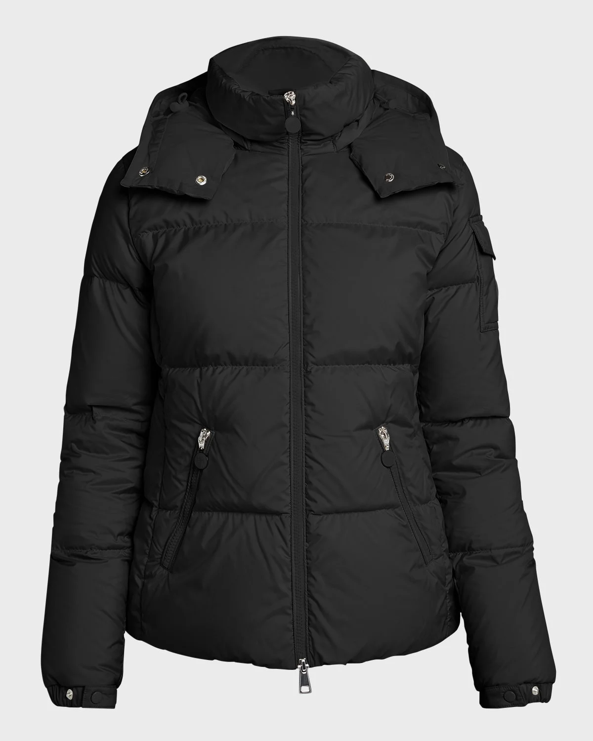 Moncler "Fourmine" puffer jacket crafted from matte nylon leger in a feminine silhouette Detachable hood with snap closures Twoway zipper closure Long sleeves; adjustable cuffs Flap pocket with logo patch at left sleeve Side zipper pockets Slim fit Polyester Lining: Nylon Fill: Down/Feather Hand wash Imported