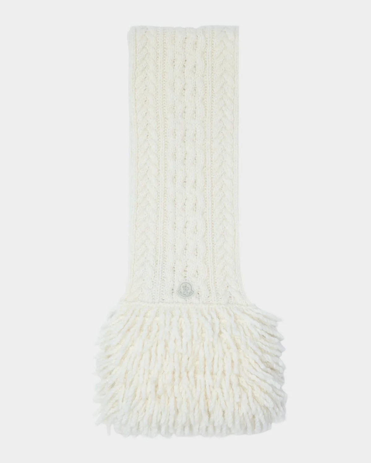 Moncler cable-knit wool-blend scarf finished with tiered fringe trim Features signature embroidered tonal logo patch May be styled in multiple ways Wool/nylon/polyamide/mohair Professional cleaning recommended Made in Italy