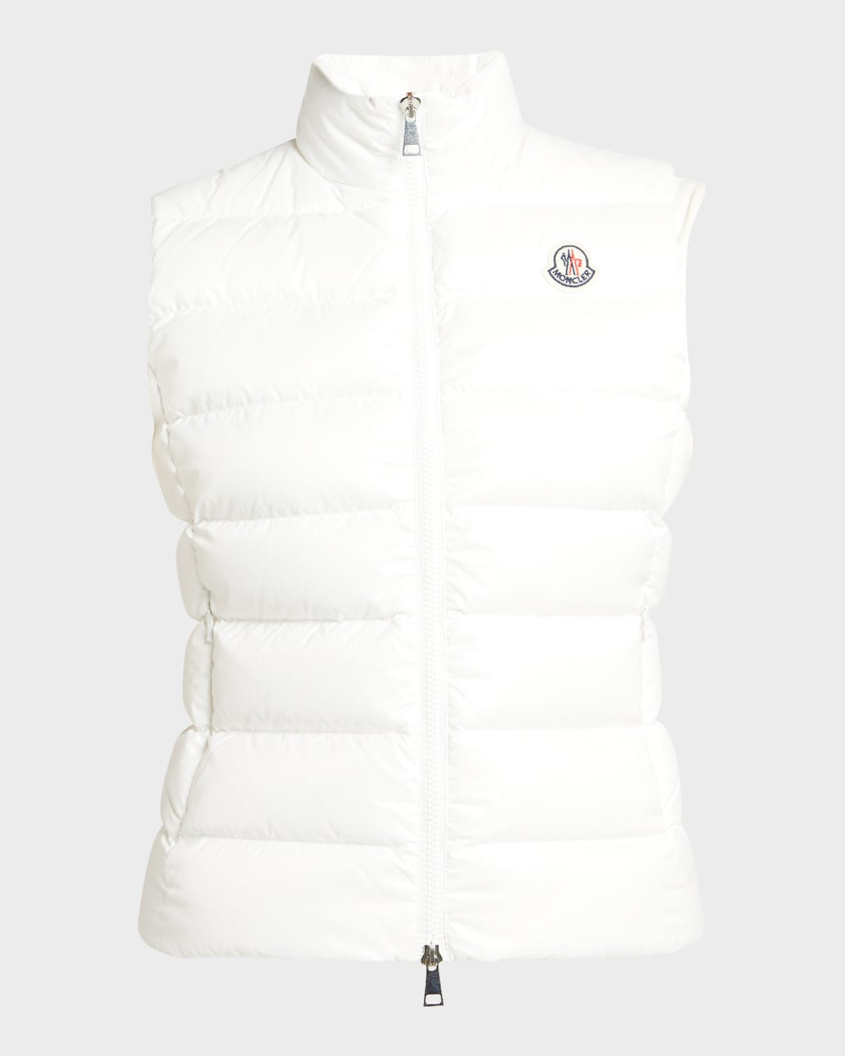 - Moncler "Ghany" Crafted from nylon laque, the down vest can be worn as urban outerwear piece during the mid-season or layered under a jacket during colder days. - Approx. 23" from shoulder to hem - Features signature felt logo on chest. - High collar; two-way front zip. - Side pockets with concealed zipper. - Short length. - Slim fit; cut to be slim across the shoulders and to fit closely along the body. - Shell and lining: nylon. - 90/10 down/feather fill. - Care instructions: Wash max 30°C (mild process); Do not bleach; Do not tumble dry; Ironing maximum temperature 110°C (without steam); Dry cleaning in tetrachloroethene or with hydrocarbons (mild process); Professional wet cleaning (mild process); Dry flat; Wash separately. - It is advisable to wash and iron the garment in reverse. - Made in Moldova. - Model is 5'10"/177cmModel is 5'10"/177cm. - Size Note: Item runs small, consider ordering a size up.