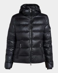 - Moncler "Gles" quilted puffer jacket featuring a hooded neckline - Long sleeve with elastic cuffs - Logo patch and flap pocket at left sleeve - Side zip pockets with logo pulls - Classic fit - Hem sits at the hip - Two-way zip-front - Nylon/polyamide - Fill: Down/feather - Lining: Nylon - Hand wash - Imported