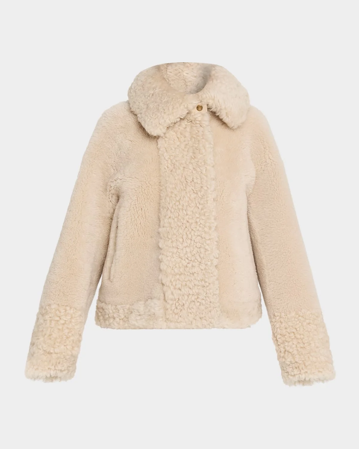 Crafted in luxurious dyed shearling (Spain), the "Gobain" jacket by Moncler combines style and warmth with down-filled paneling at the back for effortless cold-weather performance. Wide collar Long raglan sleeves Side slip pockets Oversized fit & nbsp; Two-way zip-front & nbsp; Shearling/nylon/polyamide Fill: Down/feather & nbsp; Lining: Nylon Professional cleaning recommended Made in Italy