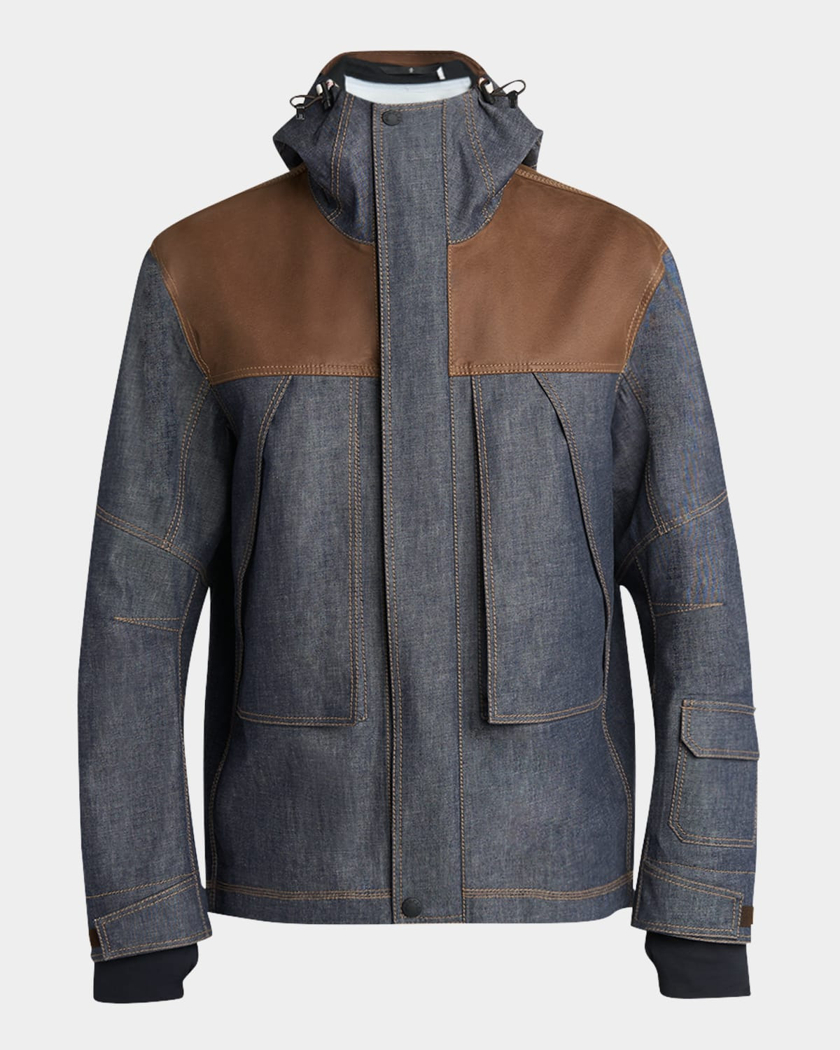- The "Langtang" jacket by Moncler Grenoble has the appearance of a denim jacket, but differs with exposed stitching and a contrasting yoke. - Drawcord hood - Covered snap/zip placket - Flap pocket and logo on the left arm - Zip pockets on the back of the sleeves - Knit cuffs with thumbhole cutouts - Cotton/nylon/polyamide/elastane - Lining: Elastane/nylon - Machine wash cold - Made in Romania