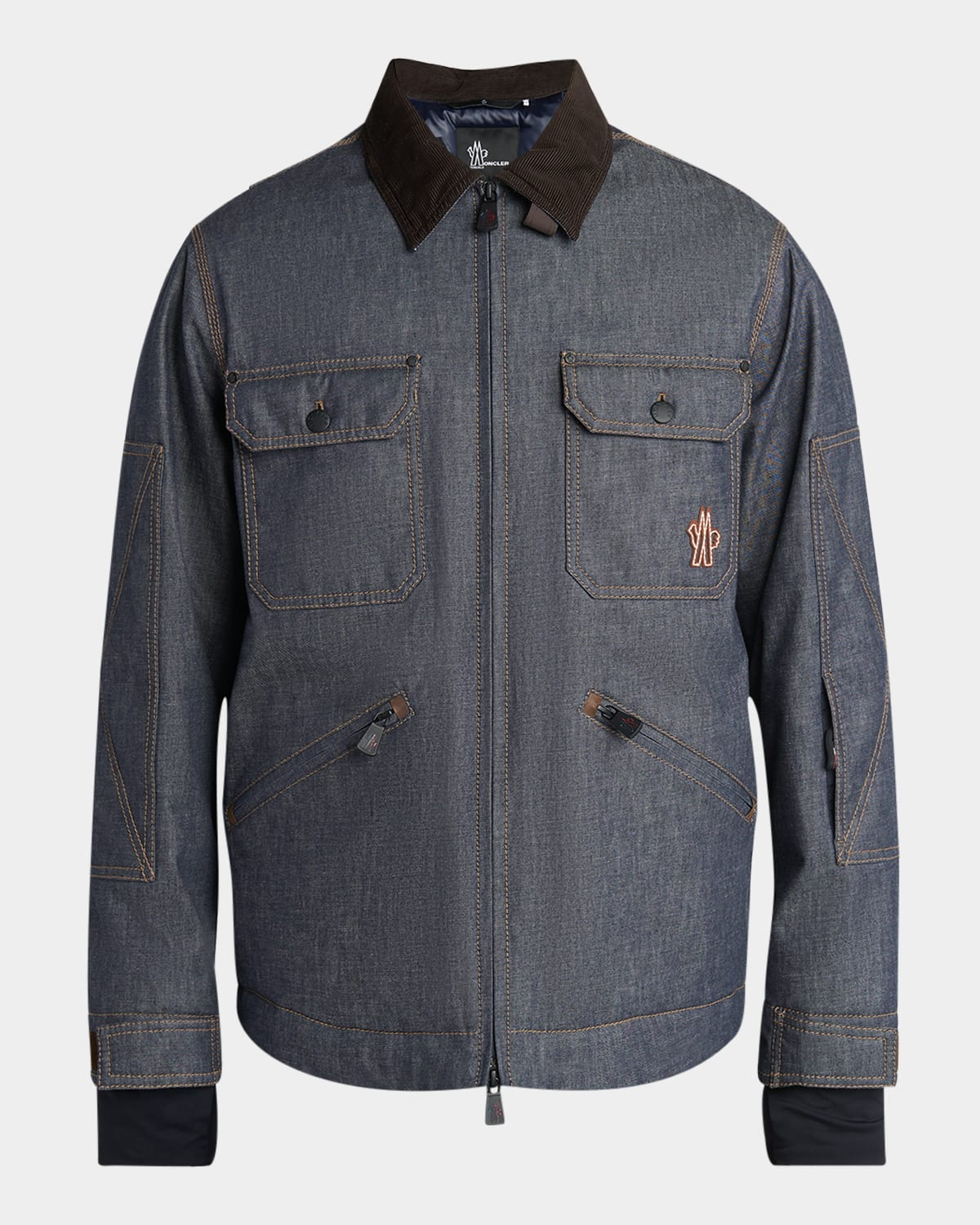 - Moncler Grenoble elevates the essential denim jacket with smart details. The contrast collar, hidden logo text, and down/feather padding of the "Croatan" denim jacket are only a few of the special features that come from this collection. - Point collar in corduroy - Two-way zipper - Flap pockets with embroidered logo - Welt zip pockets - Back zip pocket - Reinforced sleeves - Adjustable cuffs; thumbhole cutouts - Cotton/nylon/polyamide/elastane - Lining: Elastane/polyester - Machine wash cold - Made in Romania