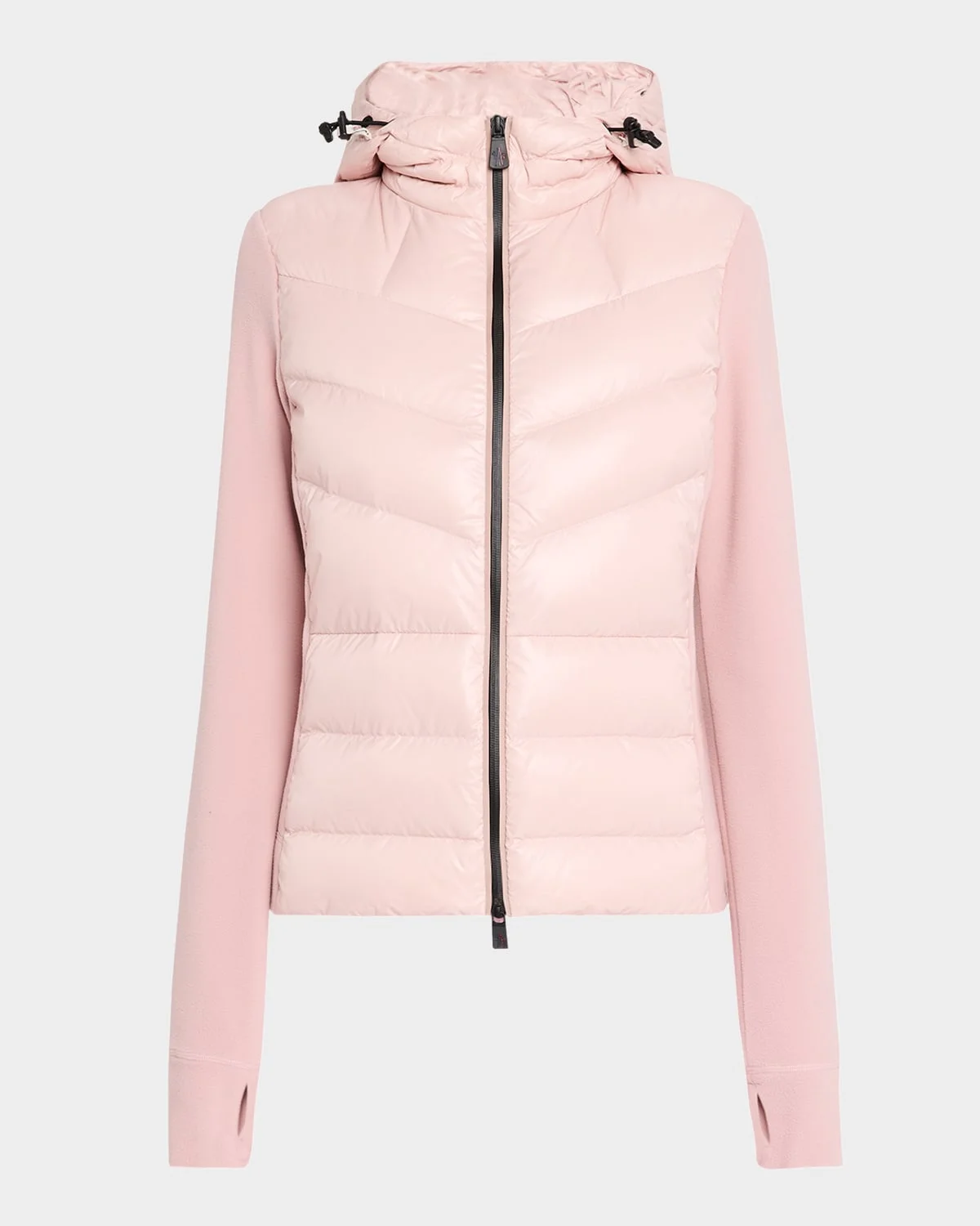 - Moncler Grenoble polar fleece cardigan with puffer paneling - Hooded neckline; adjustable drawcords - Two-way zipper closure - Long sleeves; thumbhole cuffs - Logo patch at left sleeve - Hip length - Fitted - Nylon/polyamide - Lining: Nylon - Fill: Down/Feather - Dry clean - Imported - Model is 5'10"/177cm.