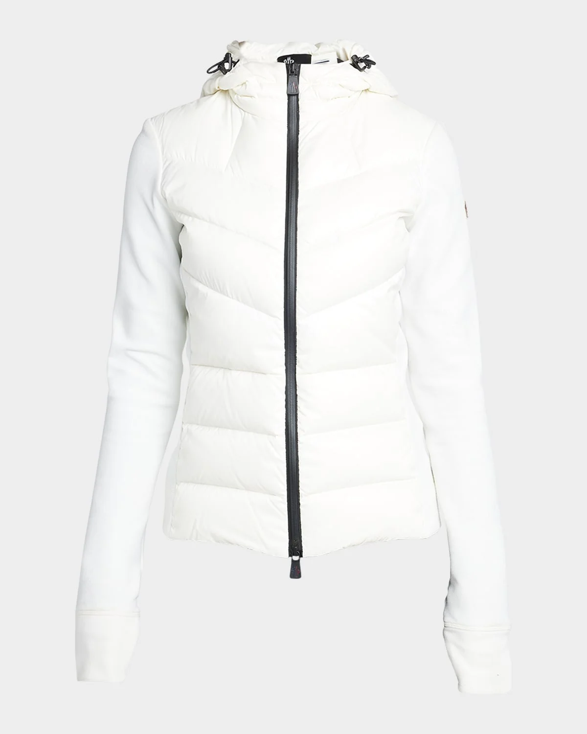 Moncler zipup cardigan features a pufferstyle bodice Hooded collar; adjustable drawstrings Twoway front zip Long sleeves; thumbhole cuffs Logo patch at left sleeve Hip length Semifitted Nylon/polyamide/elastane/polyester Lining: Nylon Fill: Down/Feather Dry clean Imported