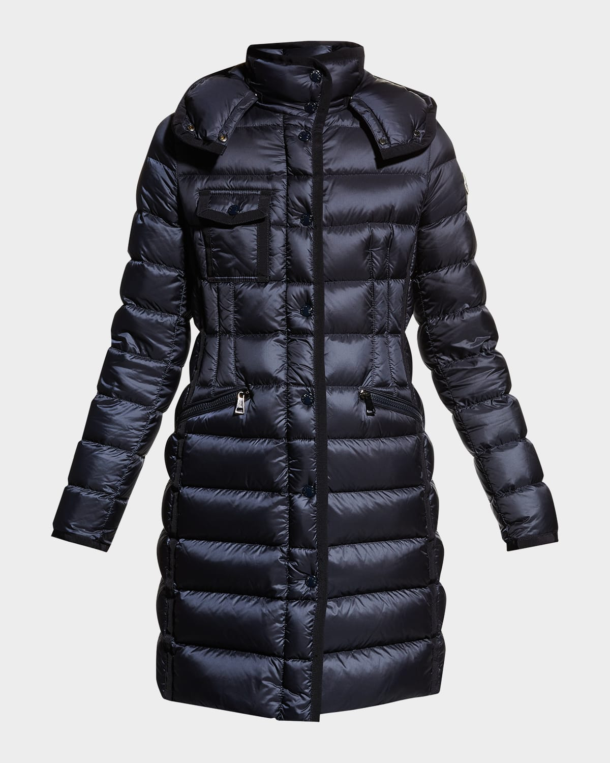 Moncler "Hermine" long puffer jacket with grosgrain trim on pockets. Approx. length: 37" Detachable hood with elastic drawcord; snap front. Long sleeves; felt logo at left arm. Flap pocket at chest. Zip pockets at hips. Tailored silhouette. Interior drawcord at waist. Aboveknee length. Ultralightweight. 90/10 down/feather fill. Self and lining: nylon. Care instructions: Hand wash; Do not bleach; Do not tumble dry; Ironing maximum temperature 110°C (without steam); Dry cleaning in tetrachloroethene or with hydrocarbons (mild process); Do not professionally wet clean; Dry flat; Wash separately. Remove detachable accessories before washing. It is advisable to wash and iron the garment in reverse. Made in Romania.