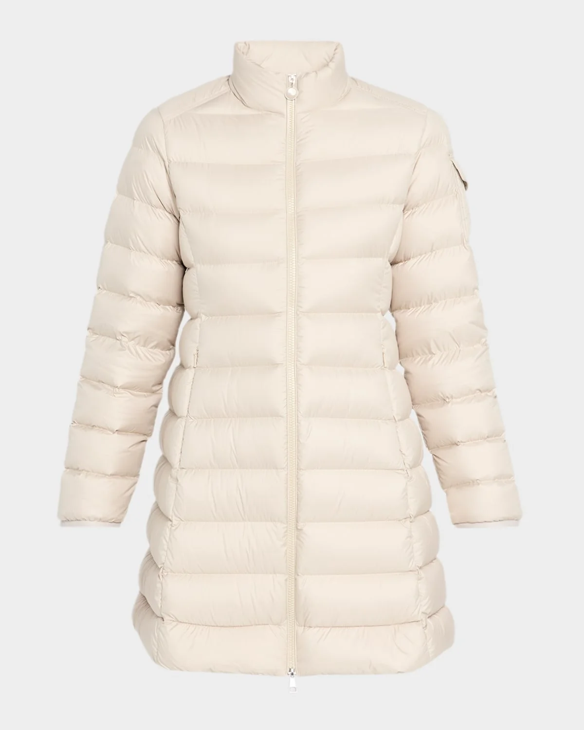 - Moncler "Igesse" long down puffer coat crafted from recycled polyester - Stand collar - Long sleeves - Left sleeve pocket with embroidered logo patch - Side zip pockets - Classic fit - Hem falls to the thigh - Two-way zip-front - Polyester - Fill: Down/feather - Lining: Polyester - Hand wash - Made in Italy