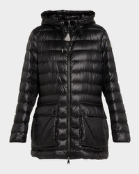 Crafted from lightweight nylon, the "Jasmin" short parka by Moncler is insulated with premium down and features a classic, midlength silhouette. Features signature embroidered logo patch on the left sleeve Adjustable drawstring hood Long sleeves with elastic cuffs Flap pockets with snap closures Classic fit Twoway zipfront Nylon/polyamide Fill: Down/feather Lining: Polyester Hand wash Imported