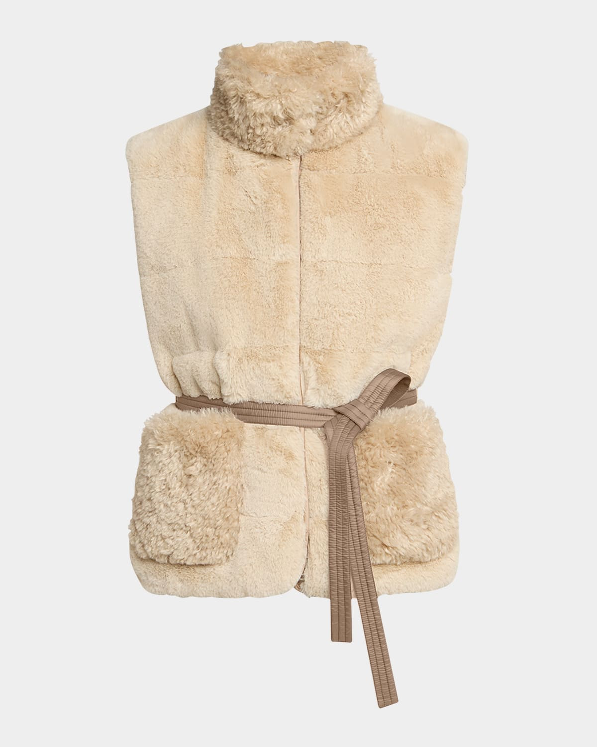 - Moncler "Joui" quilted faux fur (polyester) vest embellished with a self-tie leather belt - Stand collar - Sleeveless - Patch pockets - Classic fit - Side slit hem - Snap-front - Polyester/leather - Lining: Nylon - Professional cleaning recommended - Imported