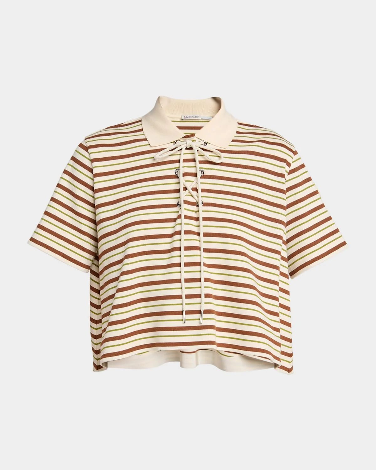 Moncler striped polo shirt adorned with a lace-up front & nbsp; Point collar Short sleeves Cropped fit Pullover style & nbsp; Cotton/polyacetelyne Lining: Nylon Machine wash cold Imported This product contains perfluoroalkyl and polyfluoroalkyl substances (PFAS). For more information, please visit the manufacturer's website.
