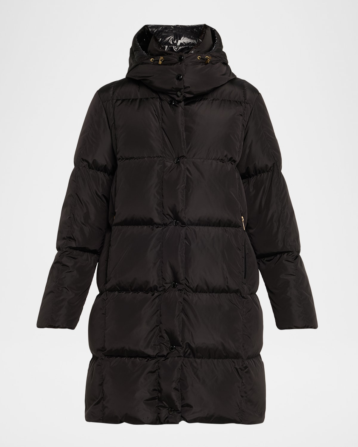 - Moncler "Litte" quilted puffer coat enhanced with contrast lining and gold-tone hardware - Stand collar; zip-off hood - Long sleeves - Signature embroidered logo patch on left sleeve - Side zip pockets - Loose fit - Mid-thigh length - Two-way zip-front - Nylon/polyamide - Fill: Down/feather - Lining: Nylon - Machine wash cold - Imported