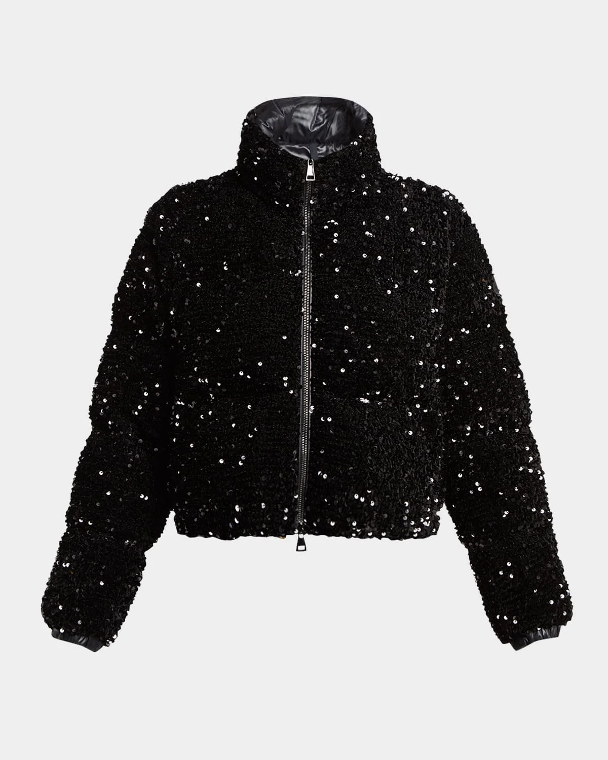 - Moncler "Louvi" sequin-embellished puffer jacket - Stand collar - Long sleeves with elastic cuffs - Signature leather logo patch on left sleeve - Invisible zip pockets - Classic fit - Hem sits at the hip - Two-way zip-front - Polyester - Fill: Down/feather - Lining: Nylon - Hand wash - Imported