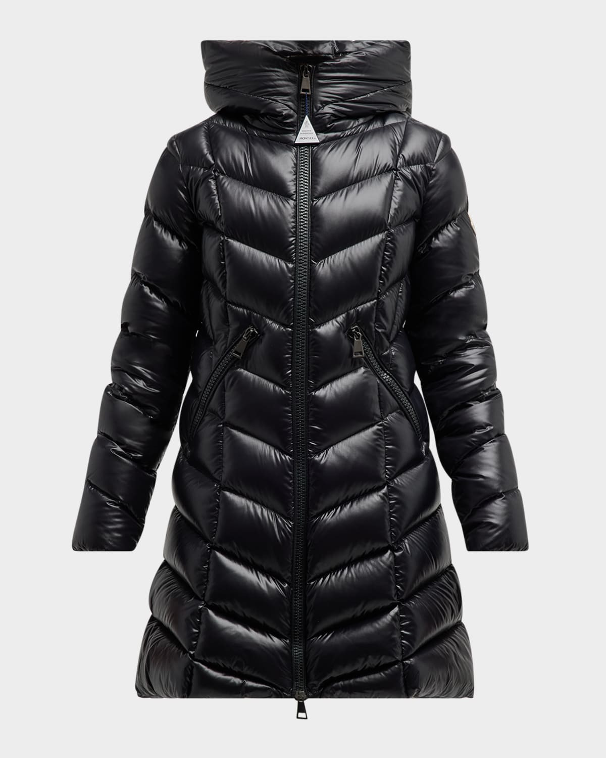 - Moncler "Marus" puffer coat is crafted from iconic nylon laque and is characterized by the chevron quilting that accentuates the silhouette - Hooded neckline; two-way zipper closure - Long sleeves - Logo patch at left sleeve - Zipped side pockets - Hem falls above the knee - Nylon/polyamide - Lining: Nylon laque - Fill: Down/Feather - Hand wash - Imported - Model is 5'10"/177cm. - Size Note: Item runs small, consider ordering a size up.