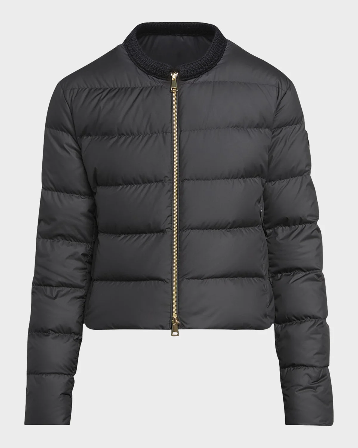 - Moncler "Mauvezin" quilted puffer jacket embellished with a heavy knit collar and gold-tone hardware - Round neckline - Long sleeves - Tonal leather logo patch at left sleeve - Side zip pockets - Classic fit - Hem sits at the hip - Two-way zip-front - Polyester/leather - Fill: Down/feather - Lining: Polyester - Hand wash - Imported