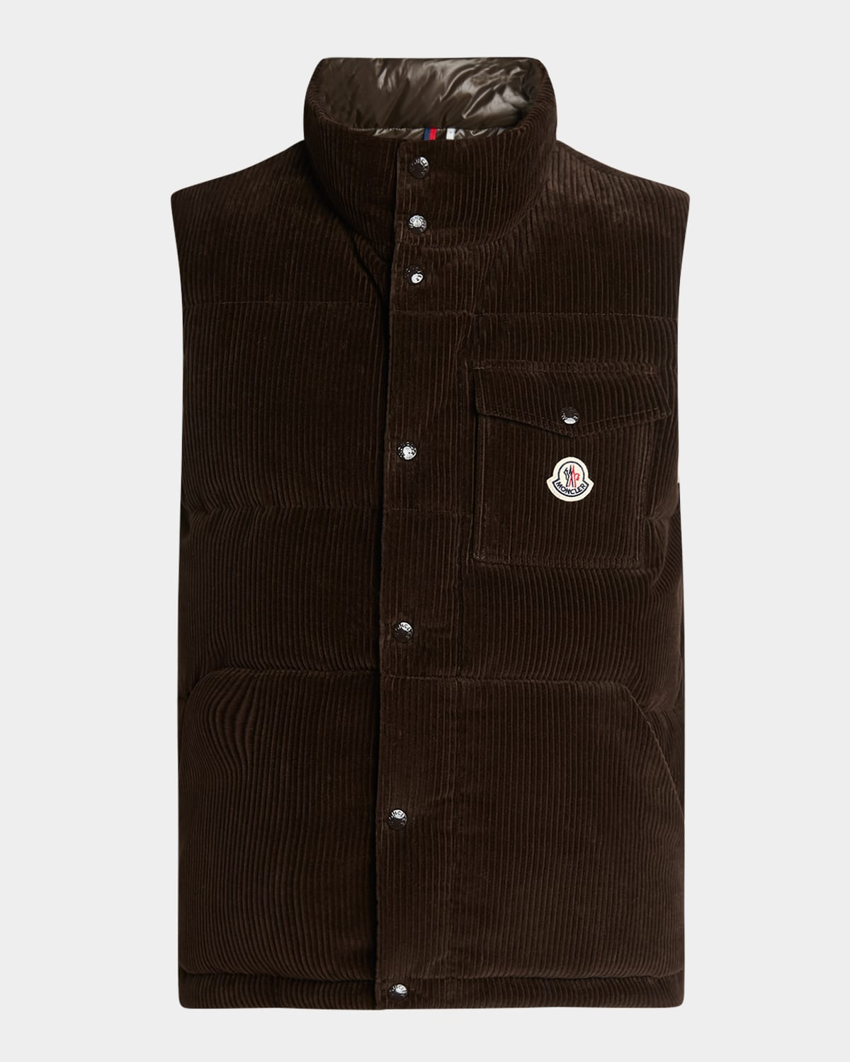 - Moncler vest in soft quilted corduroy characterized by the iconic emblem on the chest pocket - Stand collar - Full-zip front - Snap fastenings - Kangaroo pocket - Sleeveless - Cotton - Professional cleaning recommended - Made in Romania