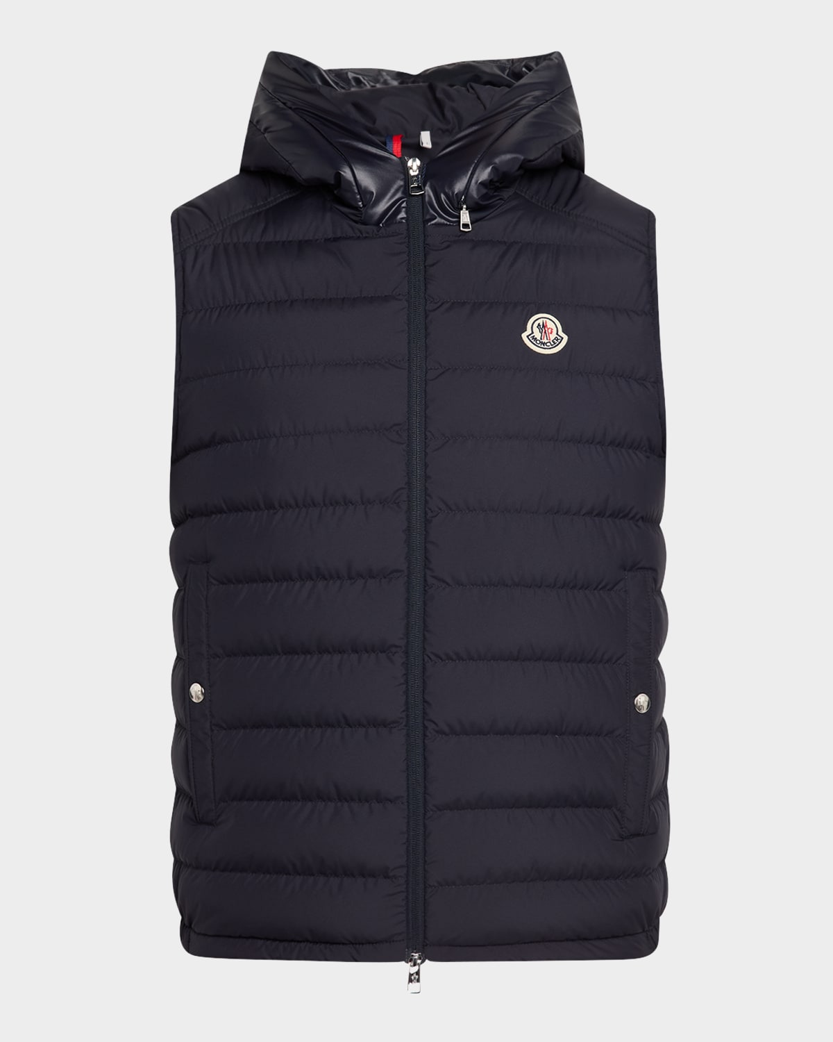 - Moncler "Bourget" vest in quilted polyester - Fixed hood with shiny logo band and zipper closure - Two-way zip front closure - Buttoned welt pockets - Sleeveless - Regular fit - Hip length - Goose down/feather fill - Lining: Polyester - Hand wash - Imported