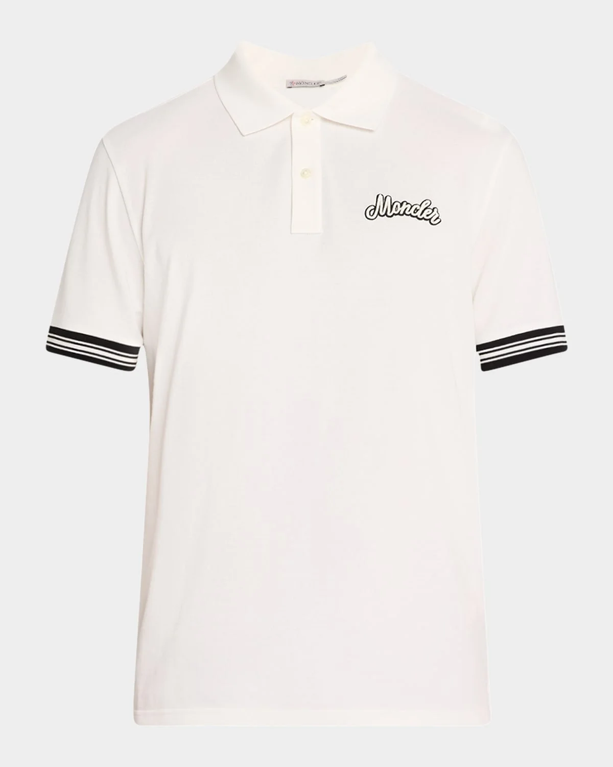 - Moncler polo shirt in cotton featuring an embroidered logo on chest - Spread collar - Two-button placket - Short sleeves - Stripe ribbed cuffs - Logo emblem on left sleeve - Pullover style - Cotton - Machine wash cold - Imported