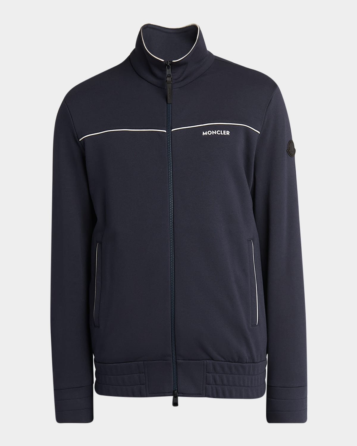 - Contrast piping and comfortable fleece create a sporty profile for this Moncler jacket. - Stand collar - Two-way zipper - Logo text front - Welt pockets - Banded cuffs and hem - Cotton/modal/polyester - Lining: Cotton/modal - Machine wash cold - Imported