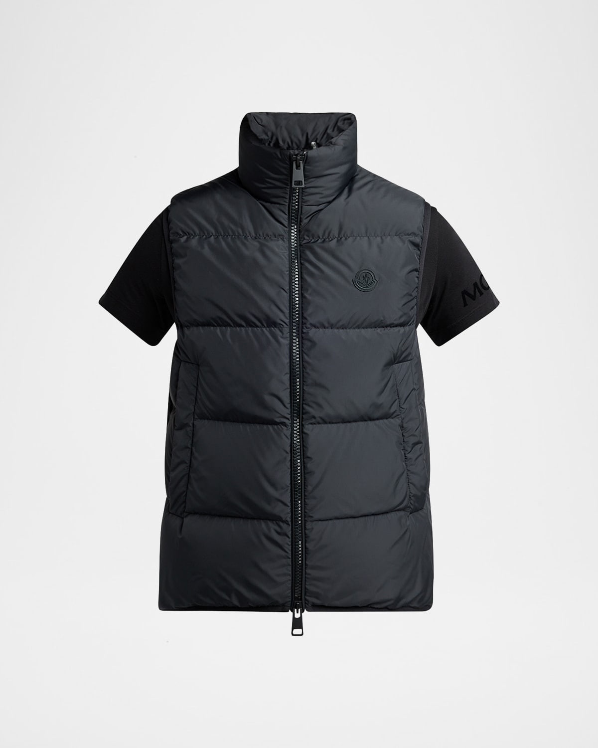 - Moncler reinvents the padded vest with this short-sleeve design. Even with this modern take, the "Gabas" vest provides warmth with a classic down/feather fill. - Stand collar - Short sleeves - Exposed two-way zipper - Tonal logo on the left chest - Side welt pockets - Cotton/nylon/polyamide - Lining: Cotton - Machine wash cold - Made in Romania