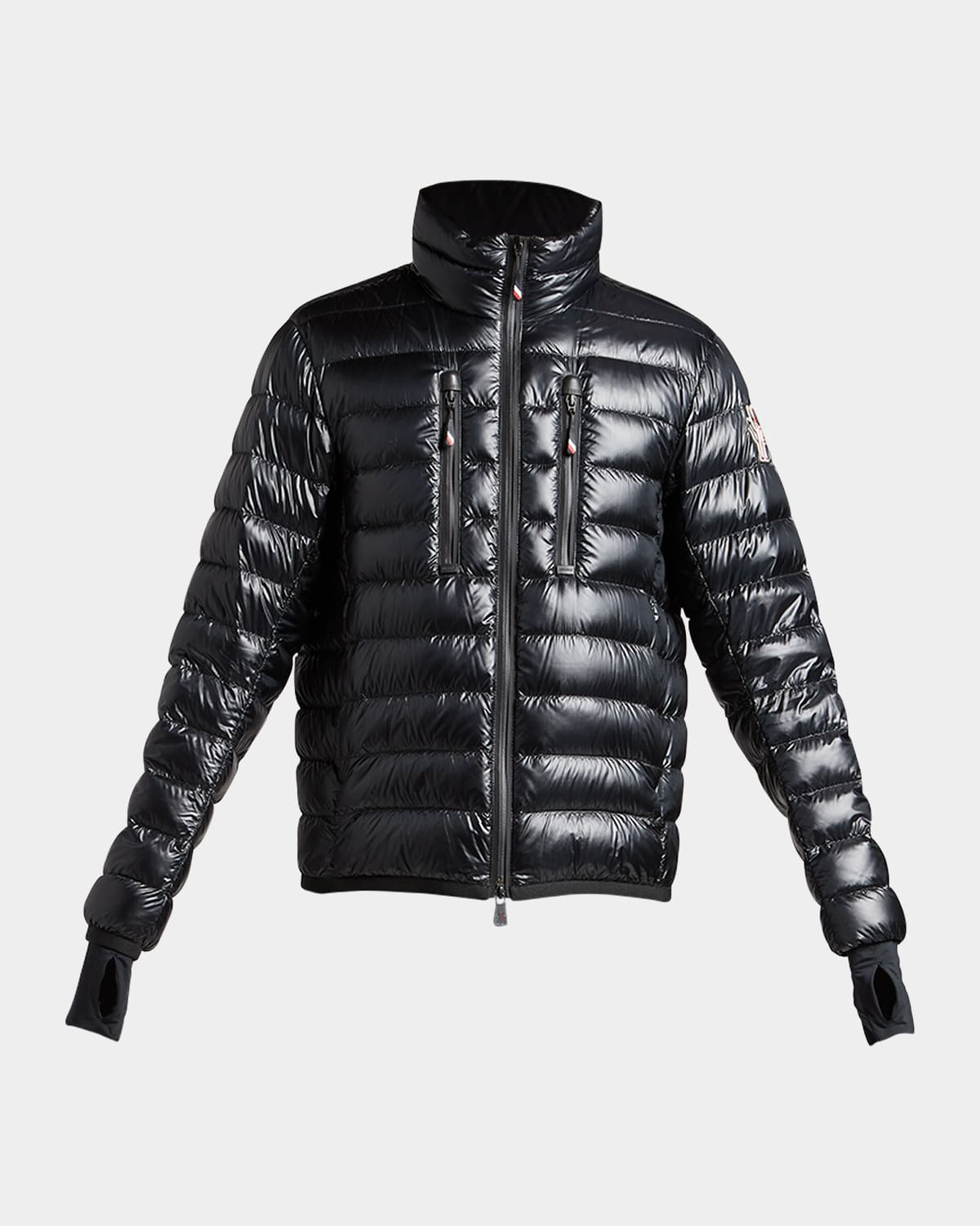 - Moncler Grenoble quilted puffer jacket with signature stripe accents - Stand collar; two-way zip closure - Zip pockets at chest - Long sleeves - Logo patch at sleeve - Thumbhole cuffs - Polyamide/elastane - Lining: Nylon/polyester - Fill: Down/feather - Made in Romania - Model is 6'1"/185cm.