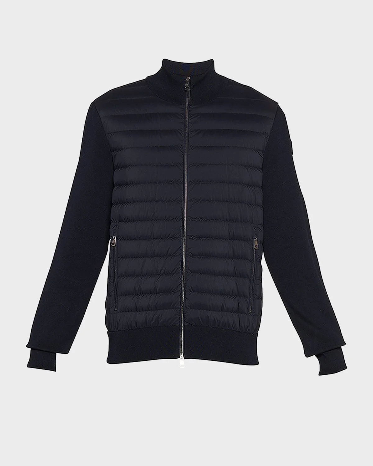 Moncler knit sweater with channeled nylon front Model is 6'1"/185cm Stand collar; twoway zip front Zip pockets Long sleeves Banded cuffs and hem Cotton/nylon/elastane Lining: Nylon Fill: Down Made in Romania