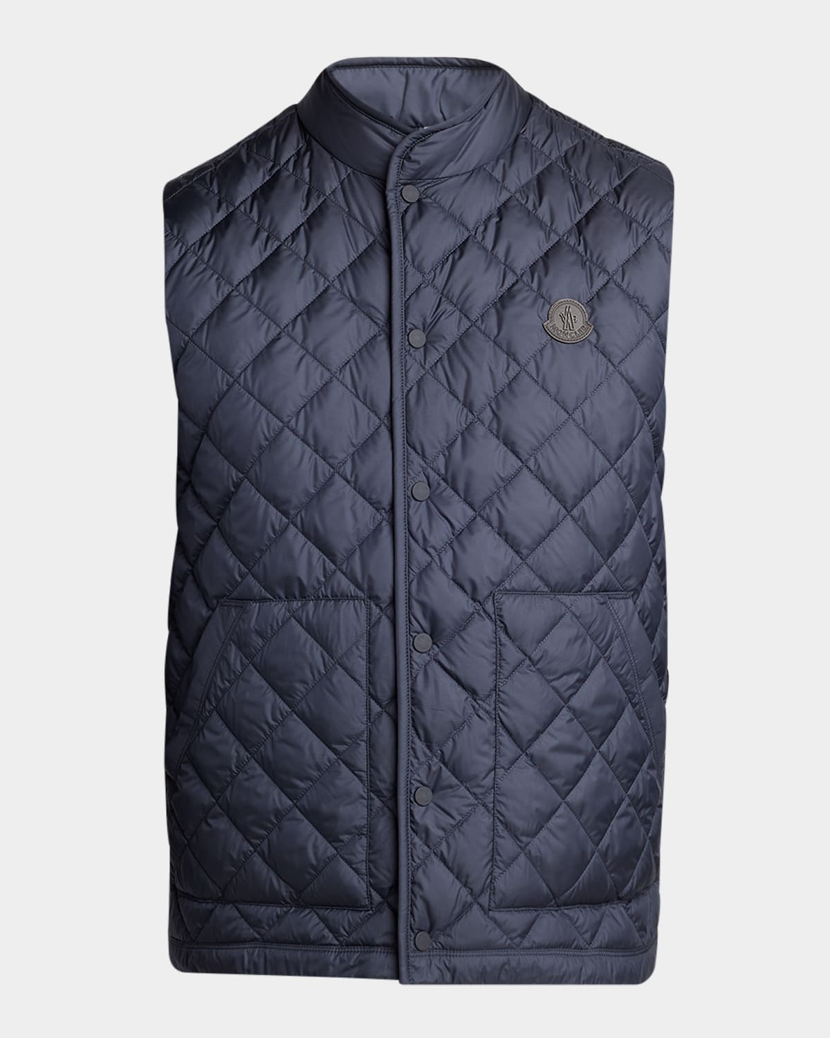 - Moncler vest with diamond quilting elevated with down/feather padded fill - Signature logo emblem on the chest in premium leather - Stand collar - Snap front - Side patch pockets - Sleeveless - Polyester/leather - Lining: Polyester - Machine wash cold - Made in Romania