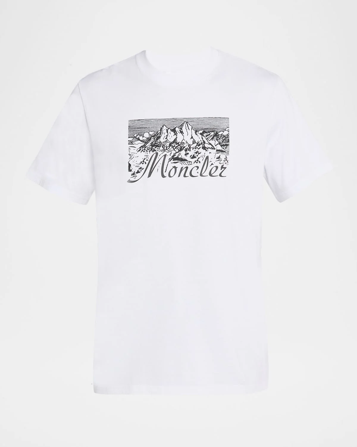 - The comfort and versatility of a classic T-shirt, but fresh and new with a Moncler mountain logo - Crew neckline - Short sleeve - Embroidered logo on the left arm - Pullover style - Cotton - Machine wash cold - Imported